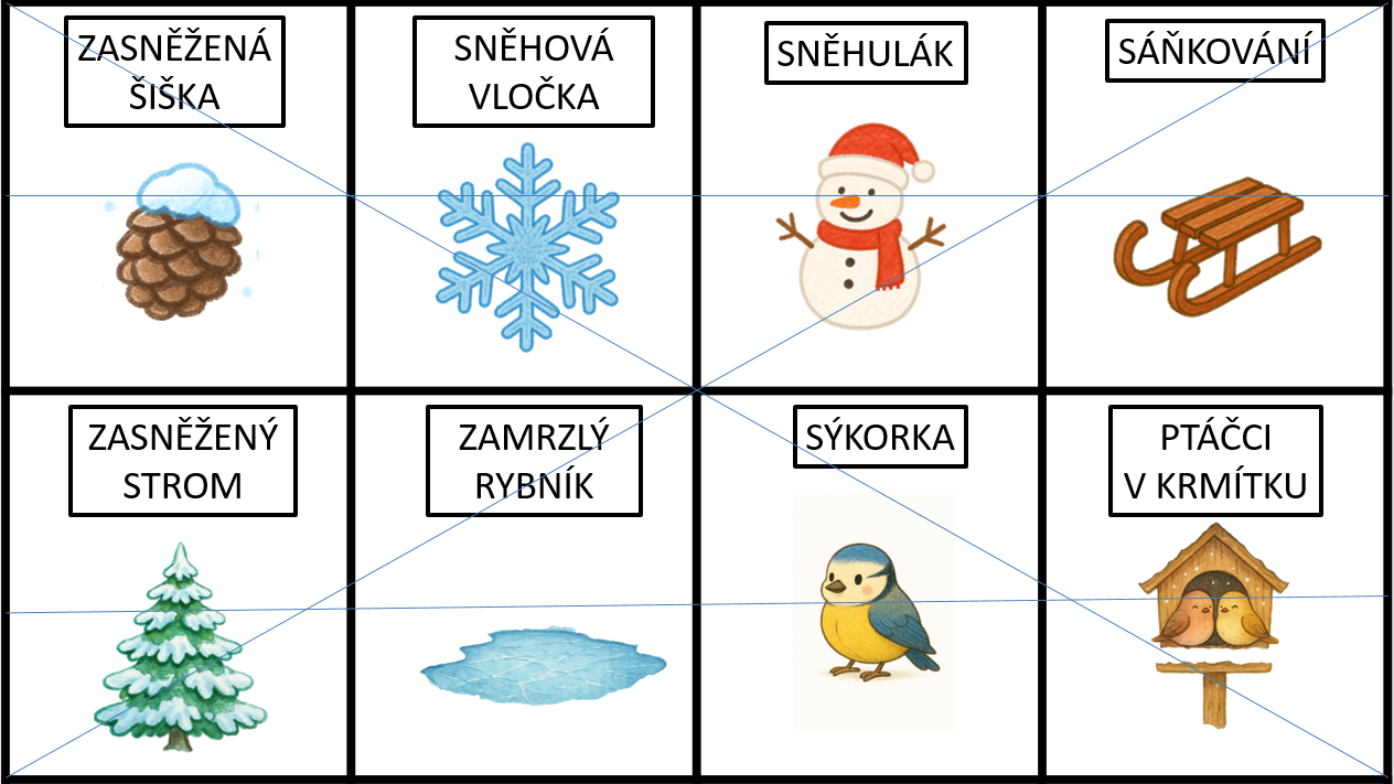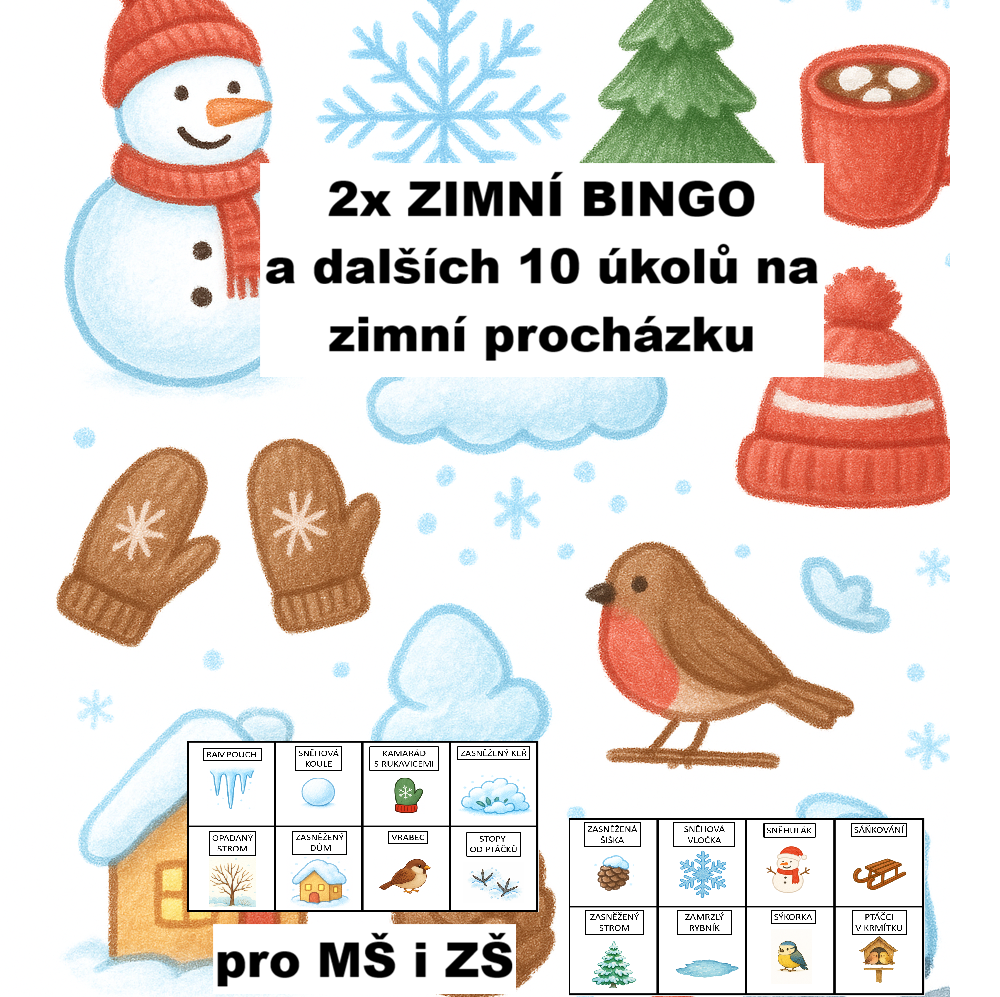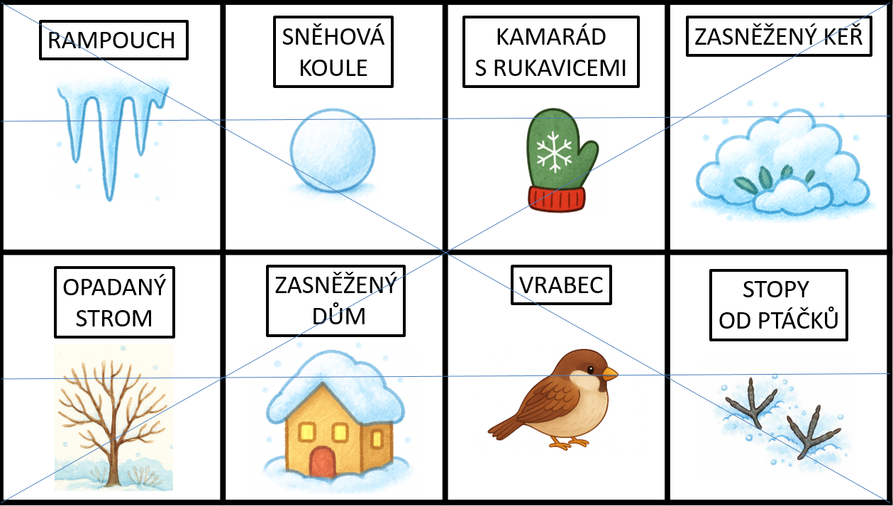 - 2 sady po 8 obrázcích se zimní tematikou (např. zasněžený strom, opadaný strom, rukavice, sáňkování, vrabec, sněhulák a další) určené k vyškrtávání či označování během procházky v zimě.