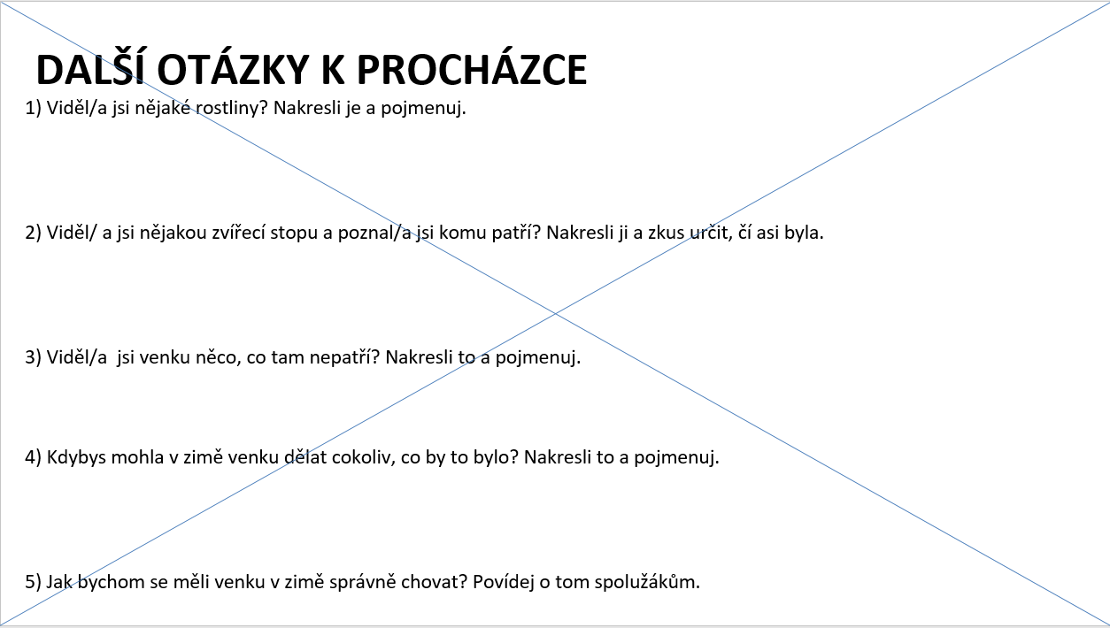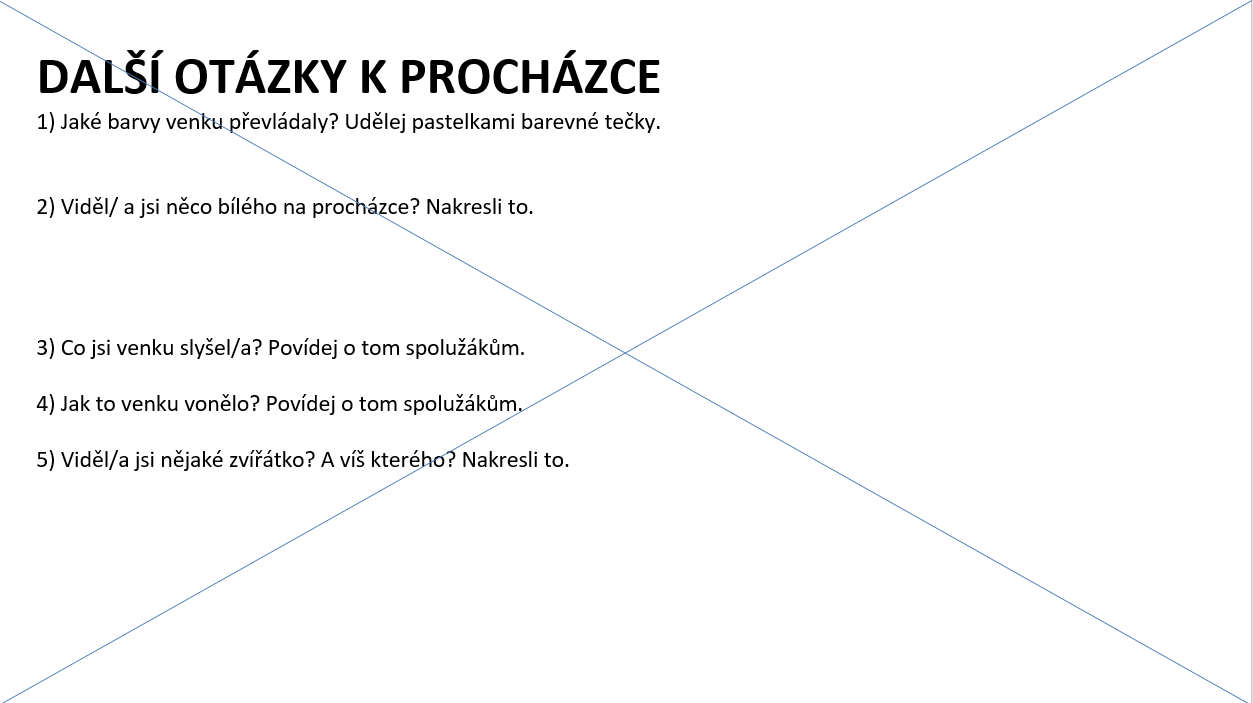 - Děti si ještě před procházkou prohlédnou obrázky i doplňující otázky, aby věděly, co budou hledat a pozorovat.