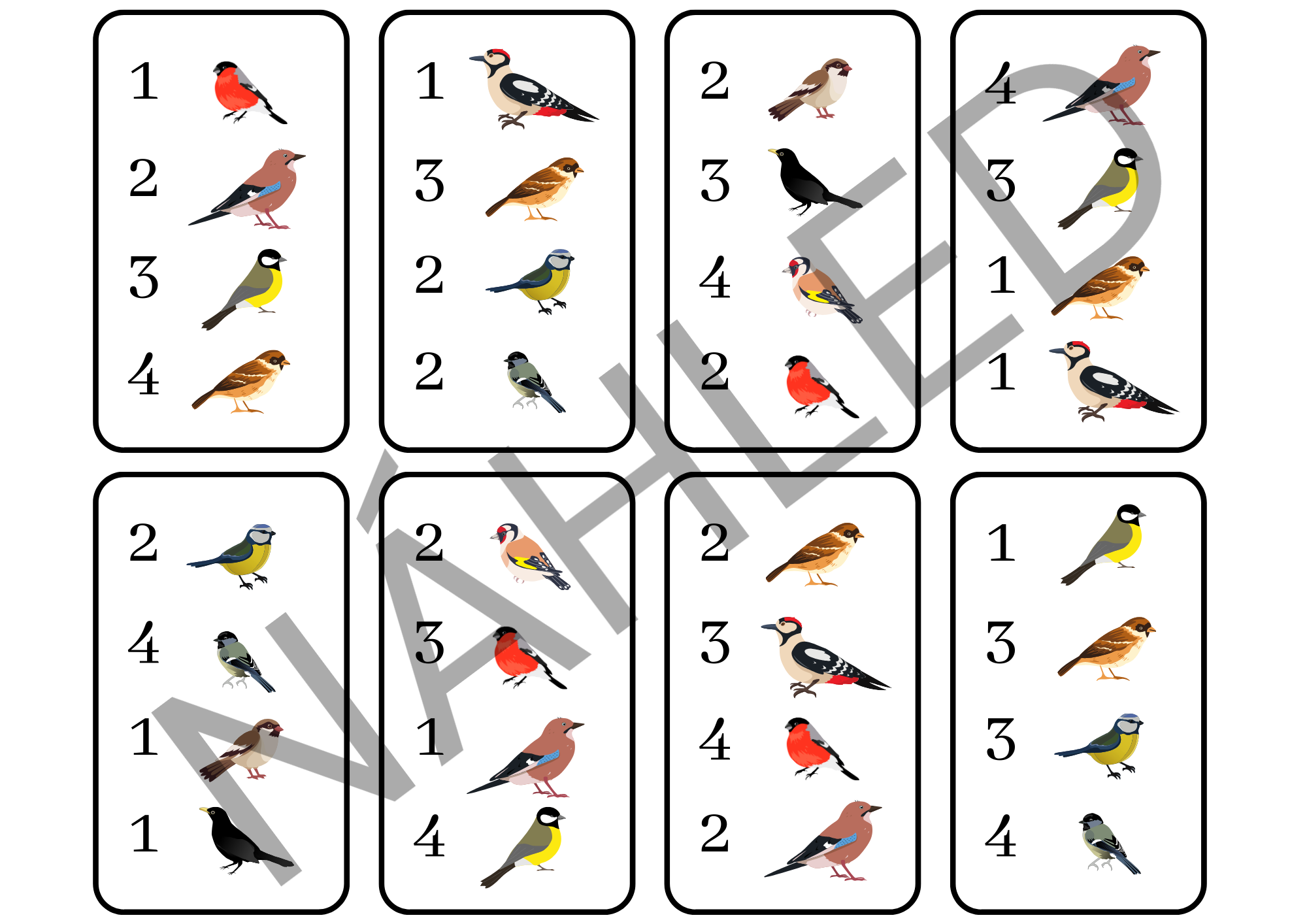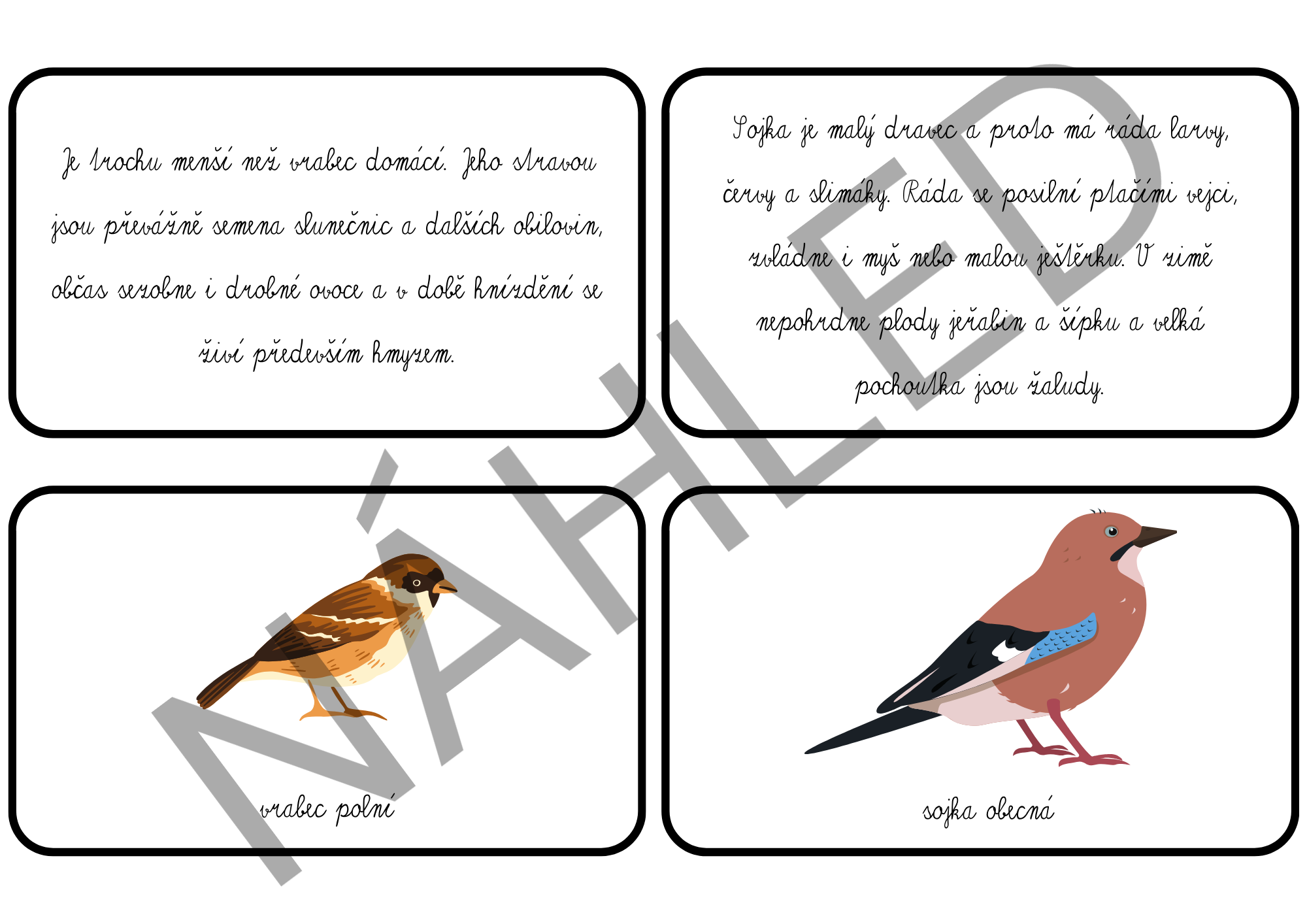 Obsah: 3 obrázky A4 se zimním pozadím a prázdným krmítkem 1 stránka s deseti druhy ptáků 10 info kartiček s oblíbenou potravou každého ptáčka 16 karet s číselným diktátem k doplňování ptáčků ke krmítku