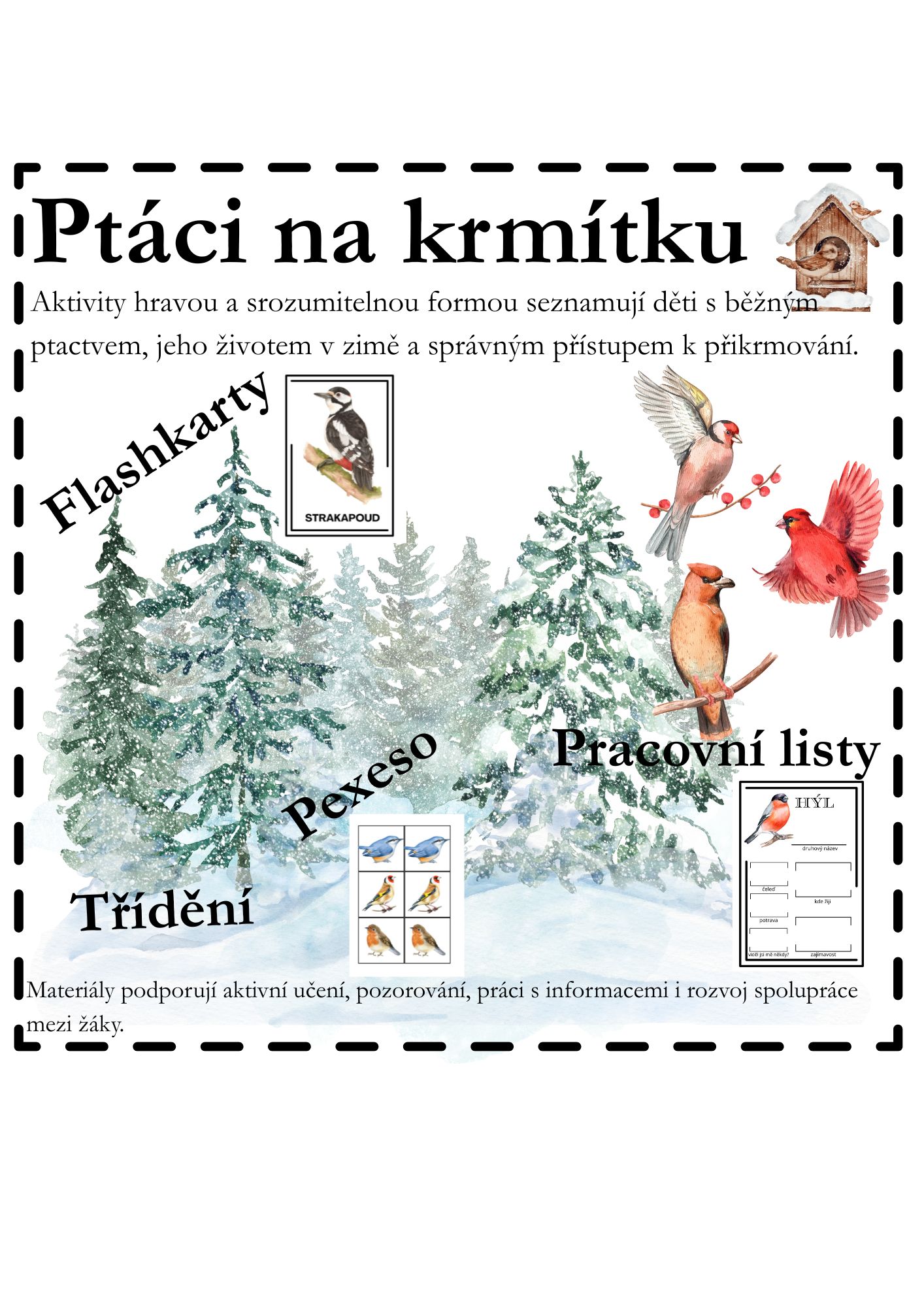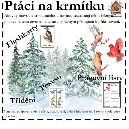 Materiál nabízí pestrou škálu aktivit – od práce s flashkartami (včetně karet bez názvu druhu), přes pexeso a pracovní listy s vyhledáváním informací na internetu, až po třídění ptáků na stálé, stěhovavé a částečně stěhovavé. Součástí je také téma správného přikrmování ptáků v zimě, které vede děti k ohleduplnému a zodpovědnému vztahu k přírodě.