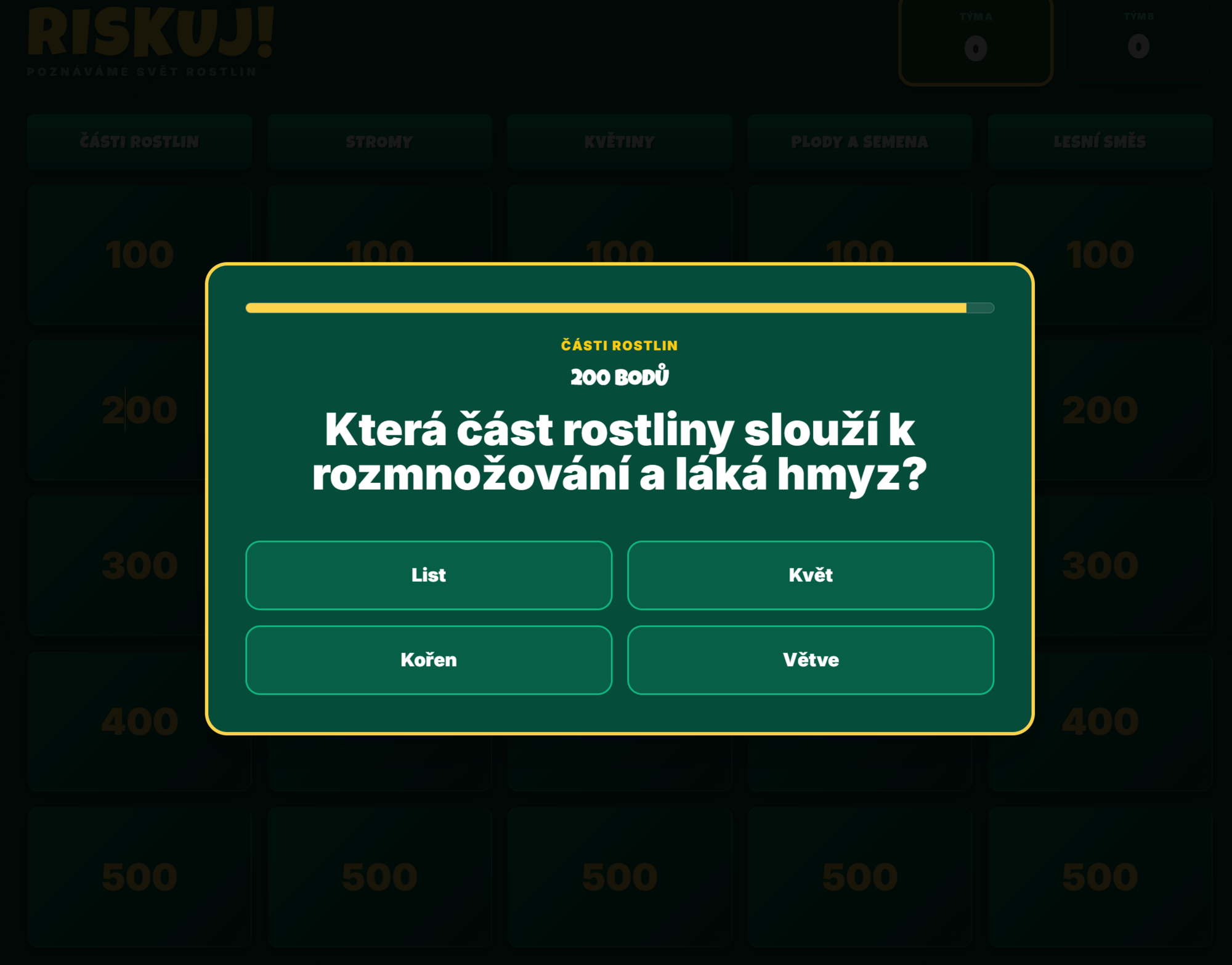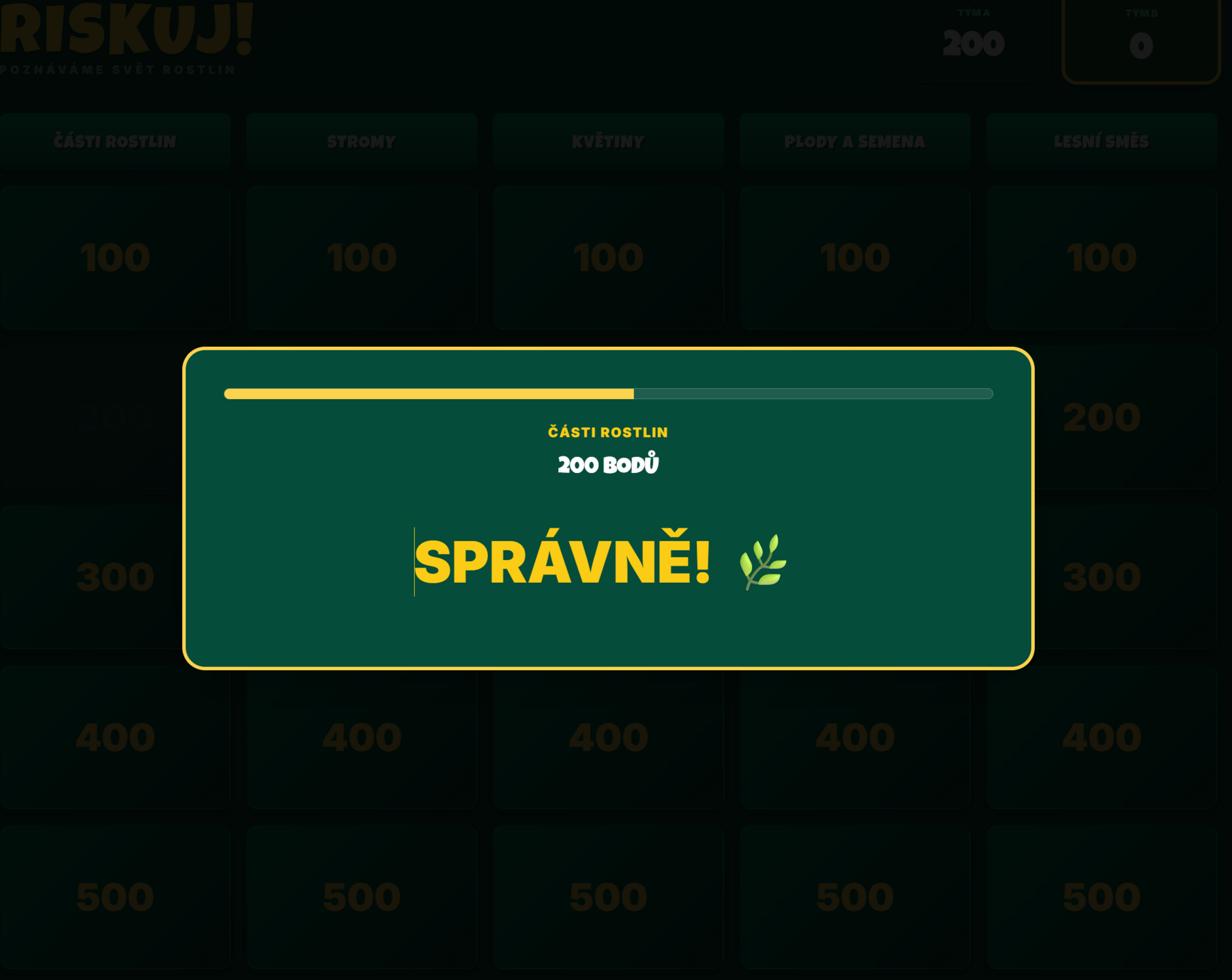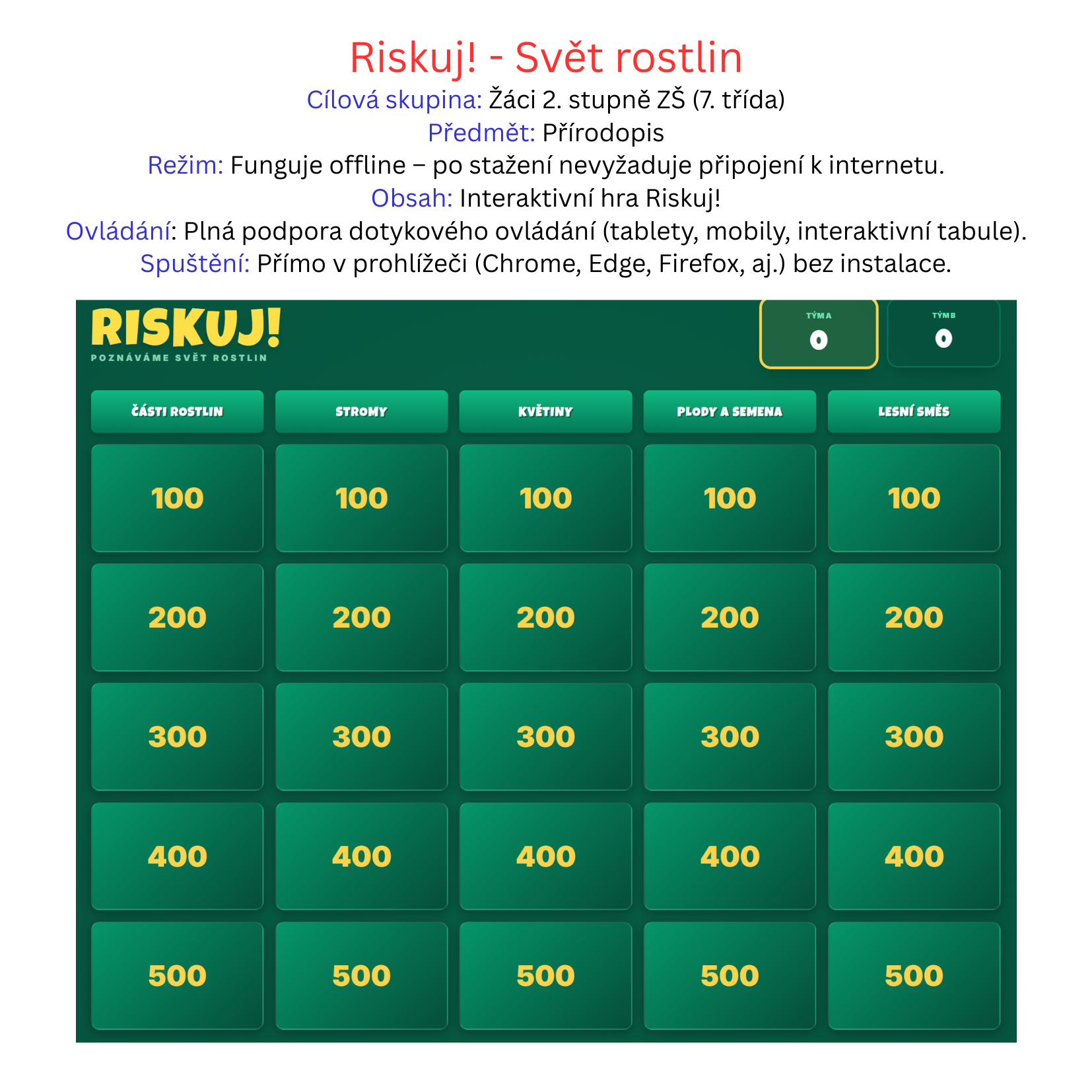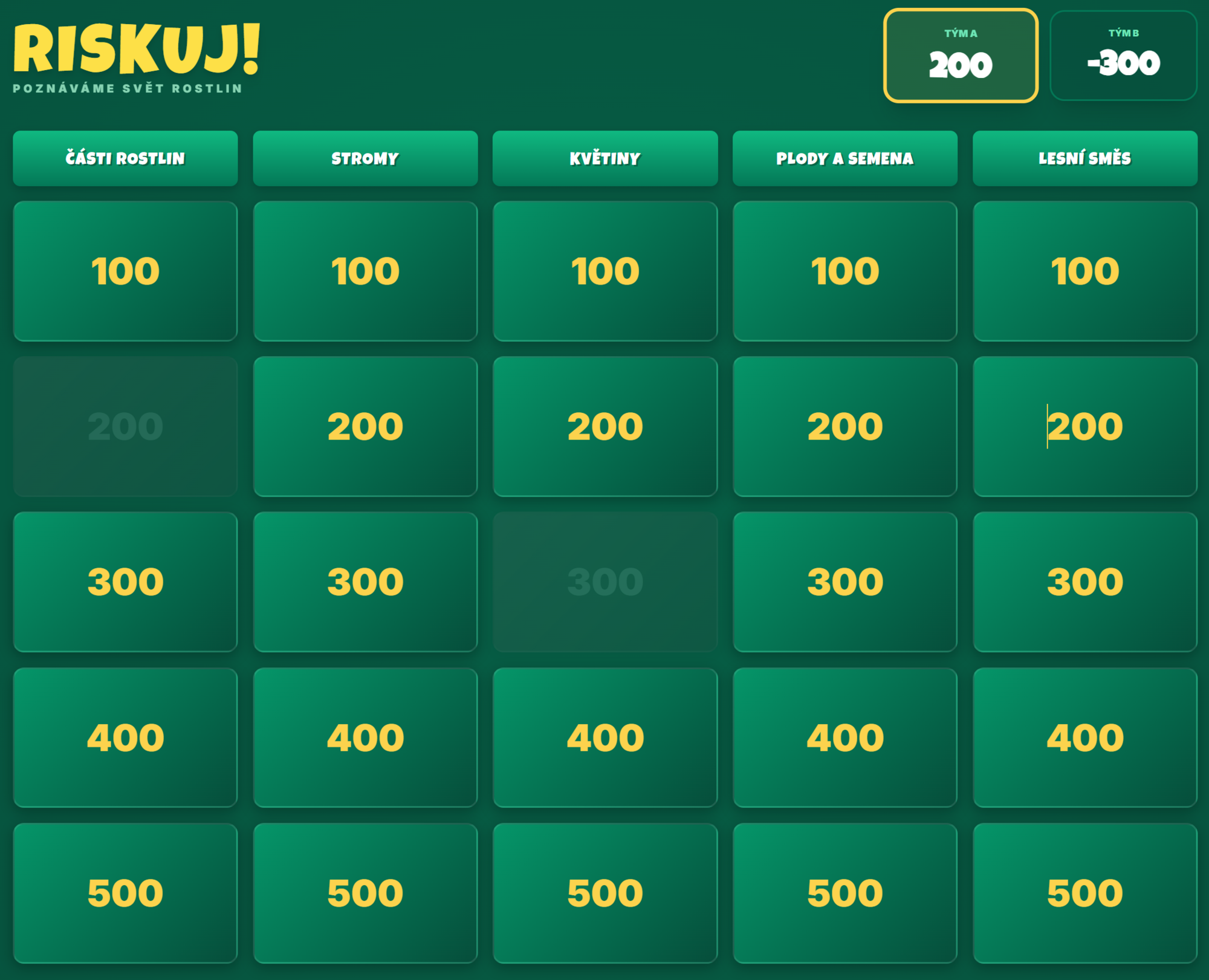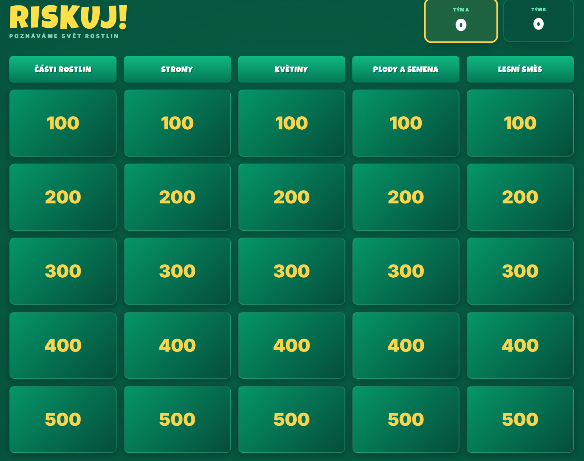 - Struktura hry: Žáci si vybírají otázky z 5 kategorií (Části rostlin, Stromy, Květiny, Plody a semena, Lesní směs) s odstupňovanou bodovou hodnotou (100–500 bodů).