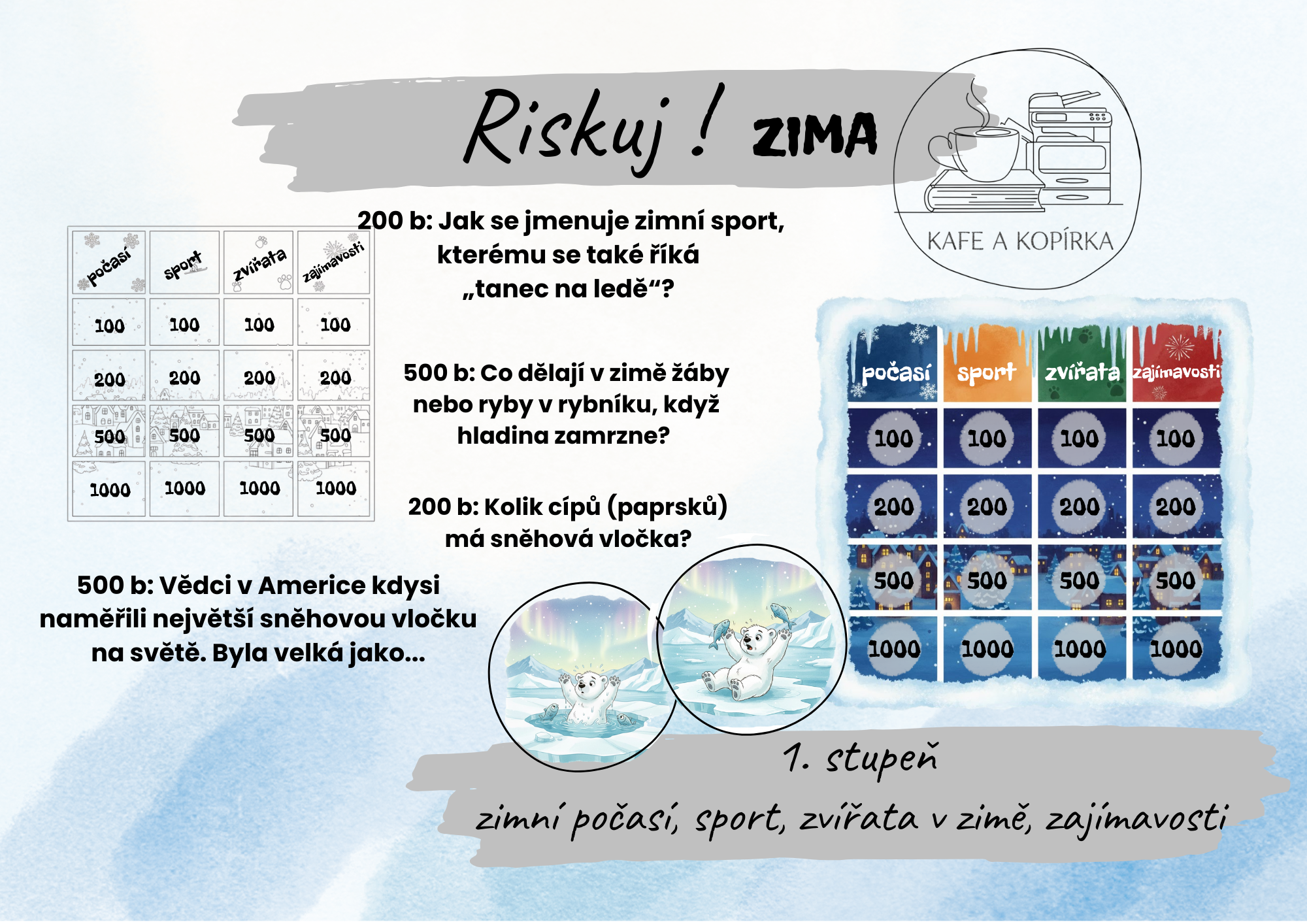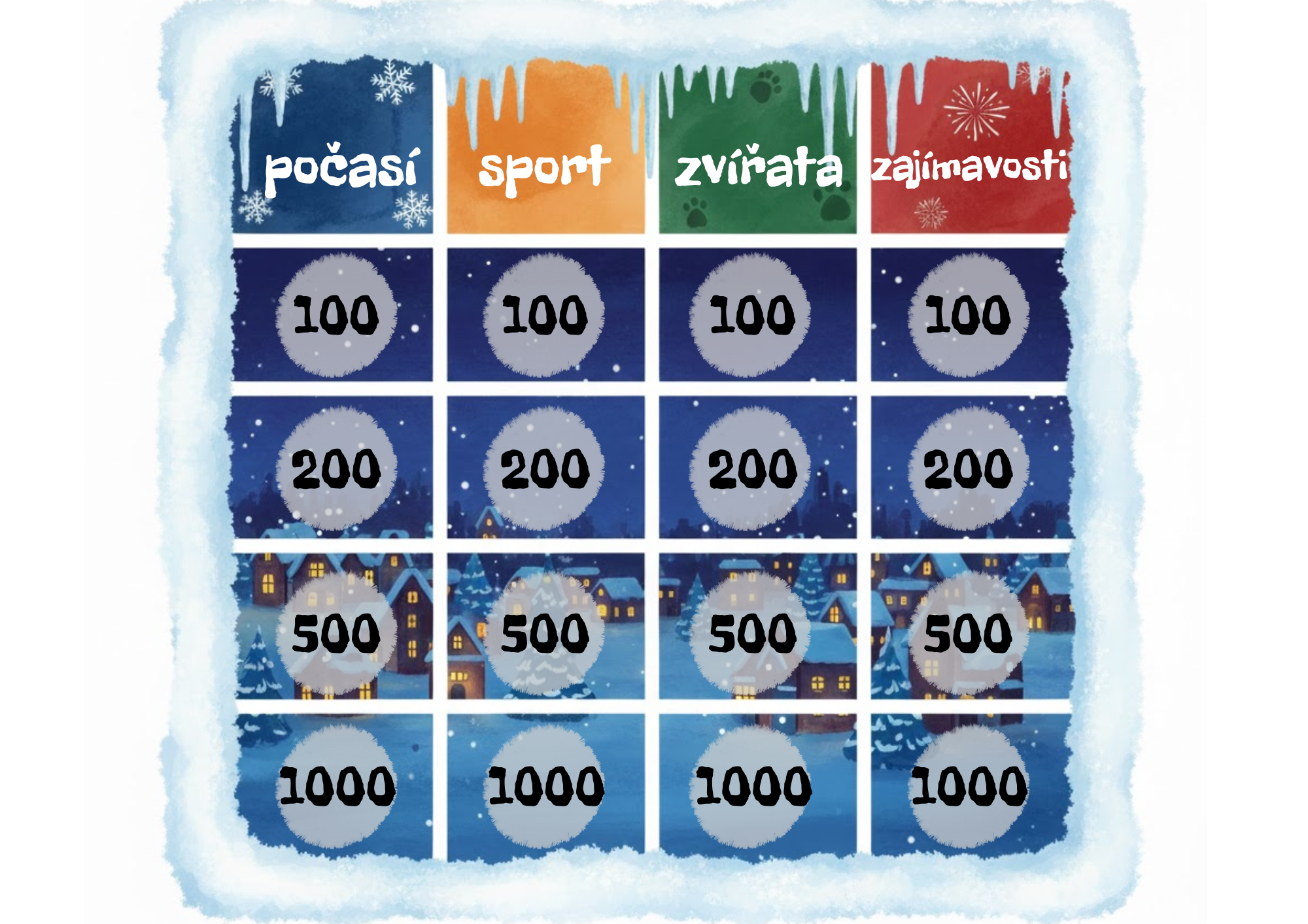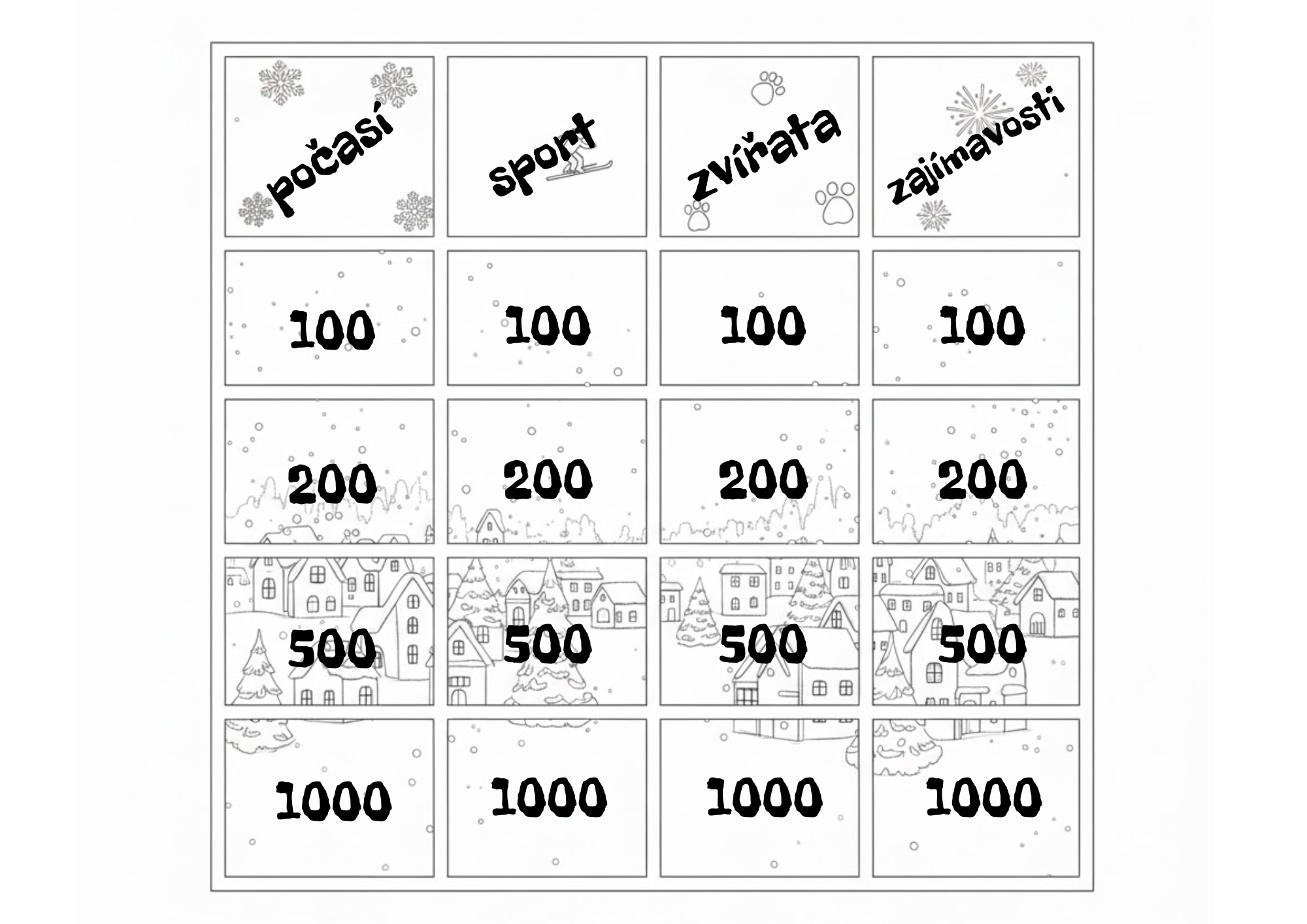 Zahrnuje 4 kategorie: počasí, sport, zvířata v zimě a zajímavosti. Otázky pro učitele jsou rozloženy na dvě strany A4. Tabulku s kategoriemi můžete žákům promítnout, nebo vytisknout. Černobílou verzi lze využít také jako arch pro záznam skóre. Soubor obsahuje i symboly pro označení chyb, které si můžete vytisknout. Každé pole lze zvolit dvakrát (ke každému jsou připraveny dvě otázky).