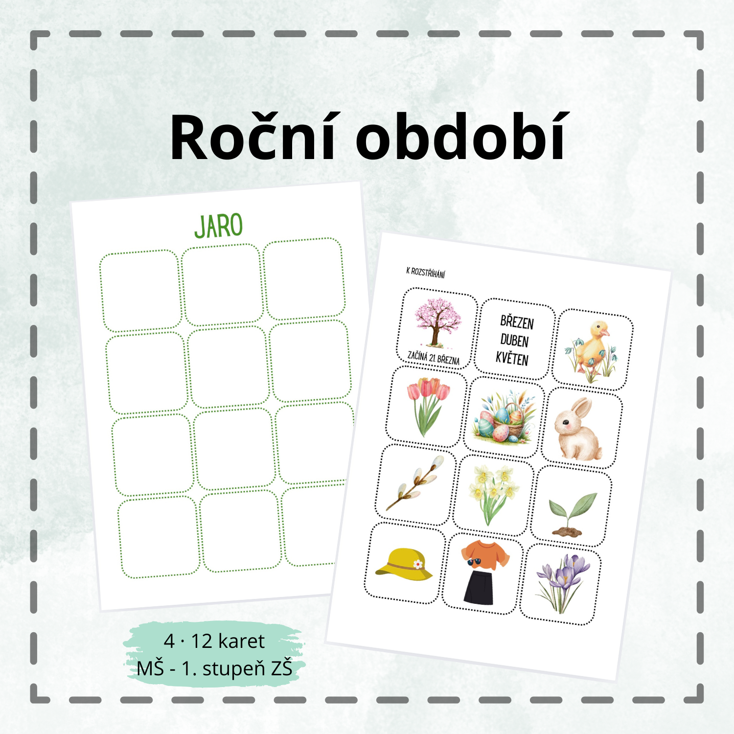 Materiál obsahuje 4 karty ročních období, na které se přikládají jednotlivé obrázky typické pro dané období. Včetně řešení.