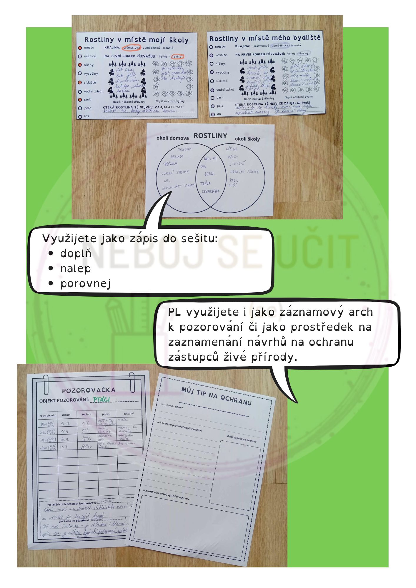 Soubor představuje komplexní materiál, který spočívá v uvědomění si rozmanitosti živé přírody v okolí místa svého bydliště a místa svojí školy. Vychází z nově revidovaného RVP ZV pro vzdělávací oblast Člověk a jeho svět - Rozmanitost přírody, u které směřuje k očekávanému výstupu CJS-CJS-004-ZV5-015. Kdy žák porovná na základě pozorování rozmanitost živé a neživé přírody ve svém okolí a realizuje zásah, kterým tuto rozmanitost podpoří. Materiál se konkrétně zaměřuje na oblast živé přírody, konkrétně na rostliny, živočichy a jejich vybrané skupiny. K dispozici je 7 sad pracovních listů (v každé sadě je jeden týkající se místa bydliště a jeden místa školy), pracovní listy s Vennovými diagramy k porovnání vybrané oblasti v okolí bydliště a školy, pozorovačka neboli záznamový arch k dlouhodobému i krátkodobému sledování vybrané skupiny rostlin či živočichů. Poslední součástí je univerzální pracovní list, Můj tip na ochranu ...., vedoucí žáka k uvědomění, jak on sám může přispět k udržitelnosti a ochraně vybraného objektu z oblasti živé přírody. Materiál je vhodný od 3. ročníku ZŠ a je určen pro černobílý tisk.