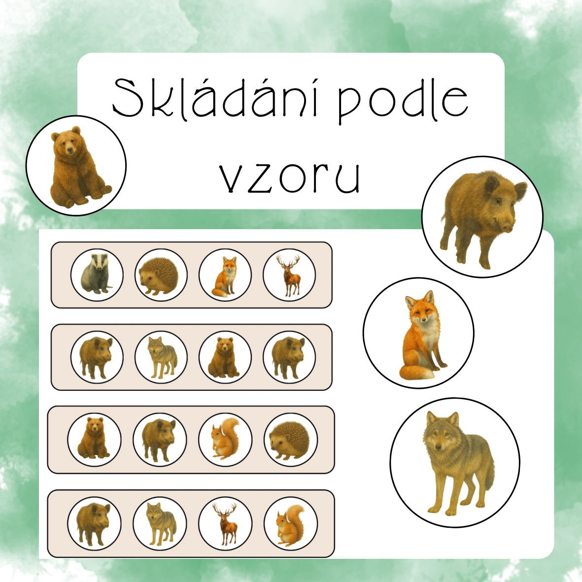 Na jedné kartičce jsou obrázky (např. jelen, vlk, prase), na druhé stejné kartičce jsou prázdná kolečka.