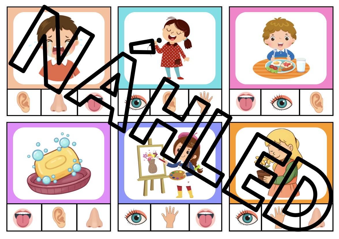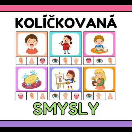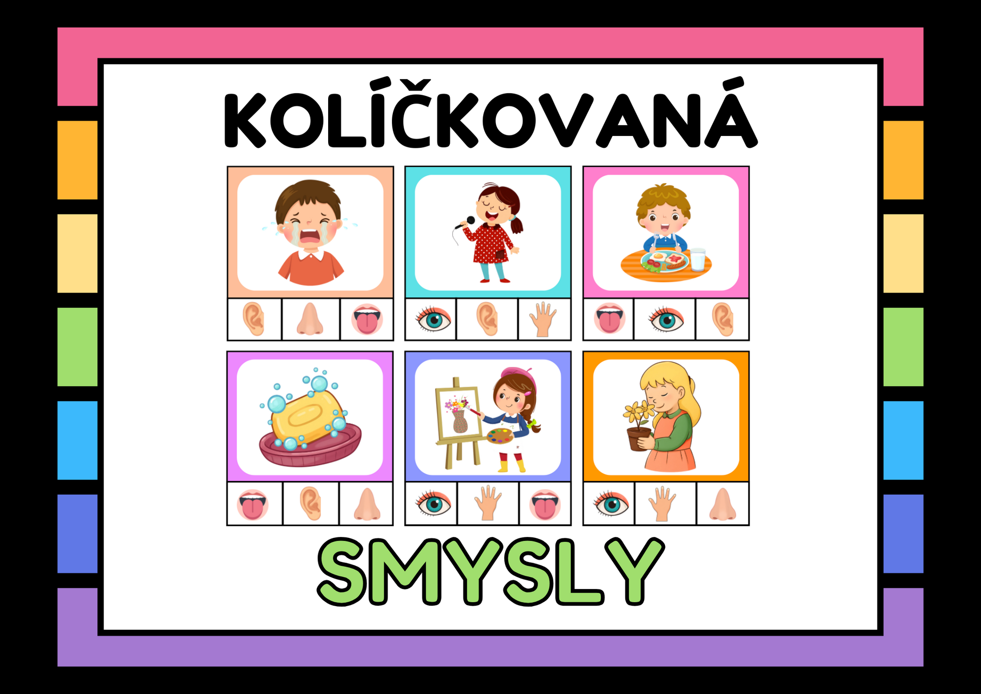 Pod každým obrázkem jsou tři smysly – nabídka smyslů. Děti připevní kolíček na ten smysl, kterým může být daná činnost na obrázku vnímána. Hra rozvíjí zrakové vnímání, soustředění a jemnou motoriku.
