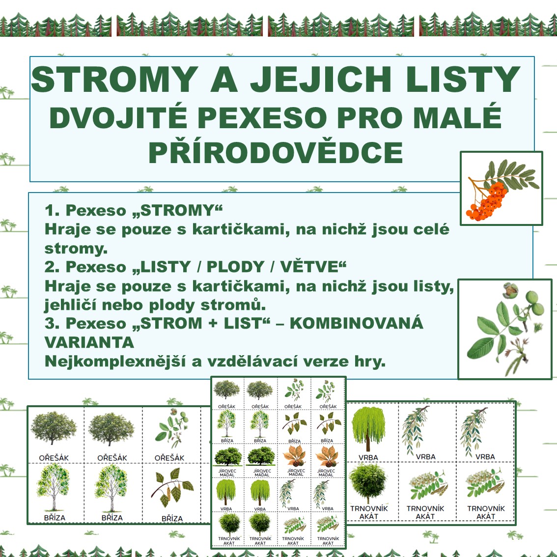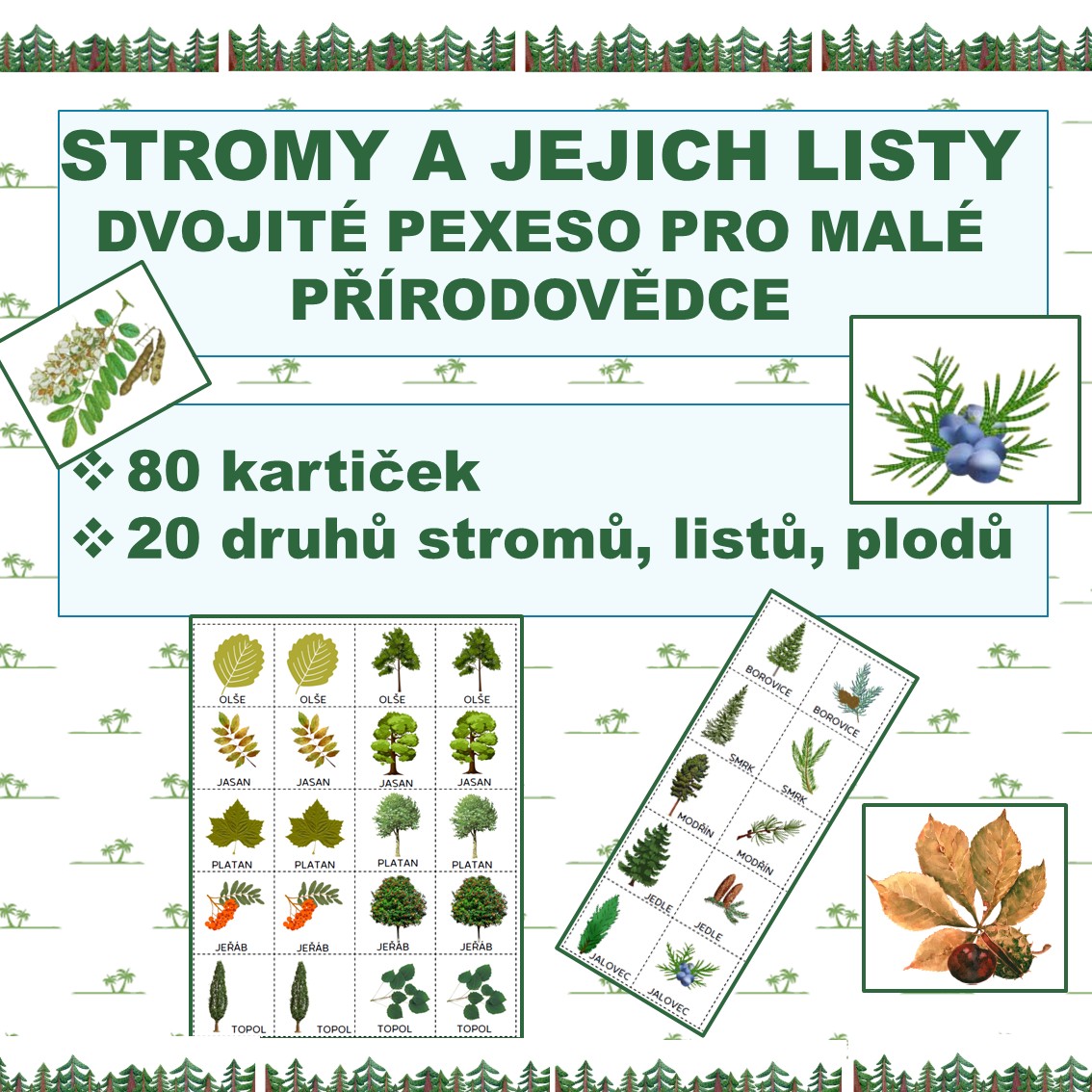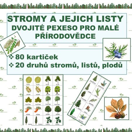 Pexeso obsahuje 80 kartiček s 20 druhy stromů, listů, plodů. Objevují se zde různé druhy jak listnatých, tak jehličnatých stromů.