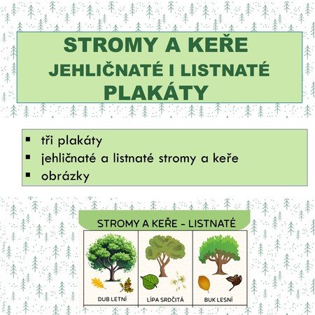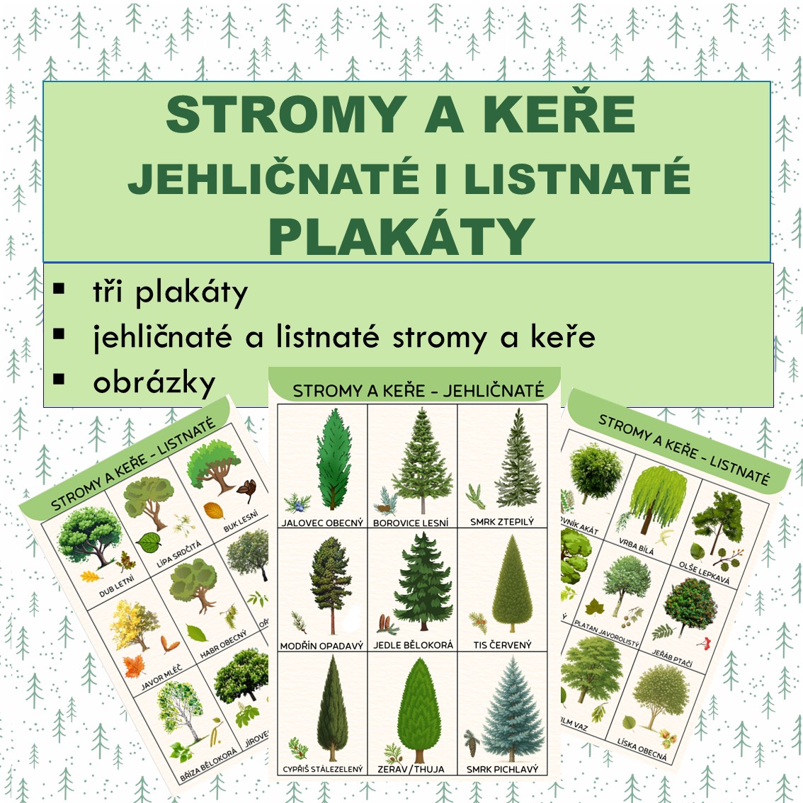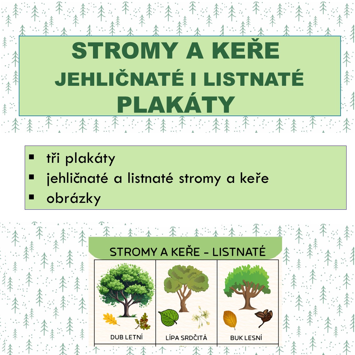 Materiál obsahuje tři plakáty s rozdělením jehličnatých a listnatých stromů a keřů jejich obrázky. Lze vytisknout na formát A3 nebo i A4 a vyzdobit jimi učebnu.