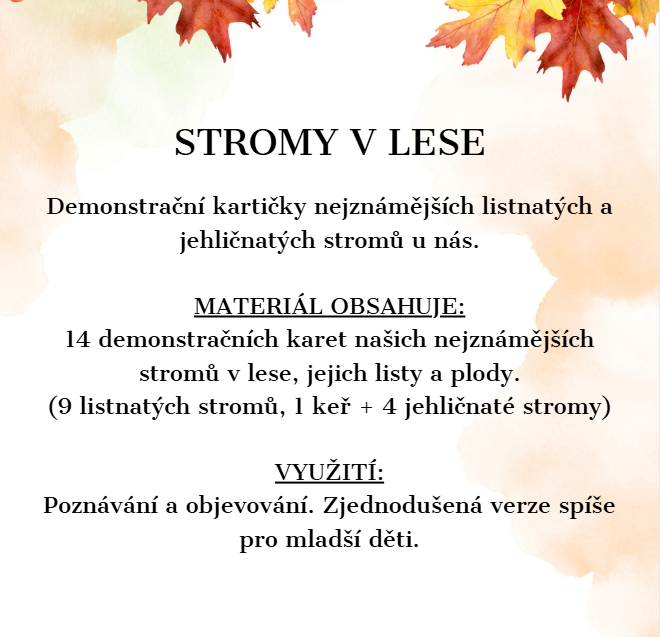 14 demonstračních karet našich nejznámějších stromů v lese, jejich listy a plody.