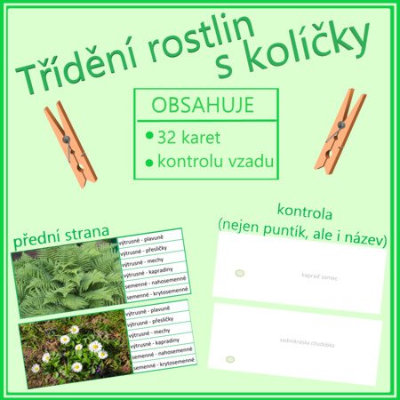 Oblíbená aktivita s kolíčky na rychlé a efektivní procvičení třídění výtrusných i semenných rostlin (plavuně, přesličky, mechy, kapradiny, nahosemenné a krytosemenné). Žák pomocí kolíčku nebo sponky označí správnou možnost. Po otočení kartičky žák rovnou vidí, zda zvolil možnost dobře. Kontrola obsahuje kromě puntíku také název rostliny na obrázku. Materiál stačí oboustranně vytisknout, případně zalaminovat a nastříhat.