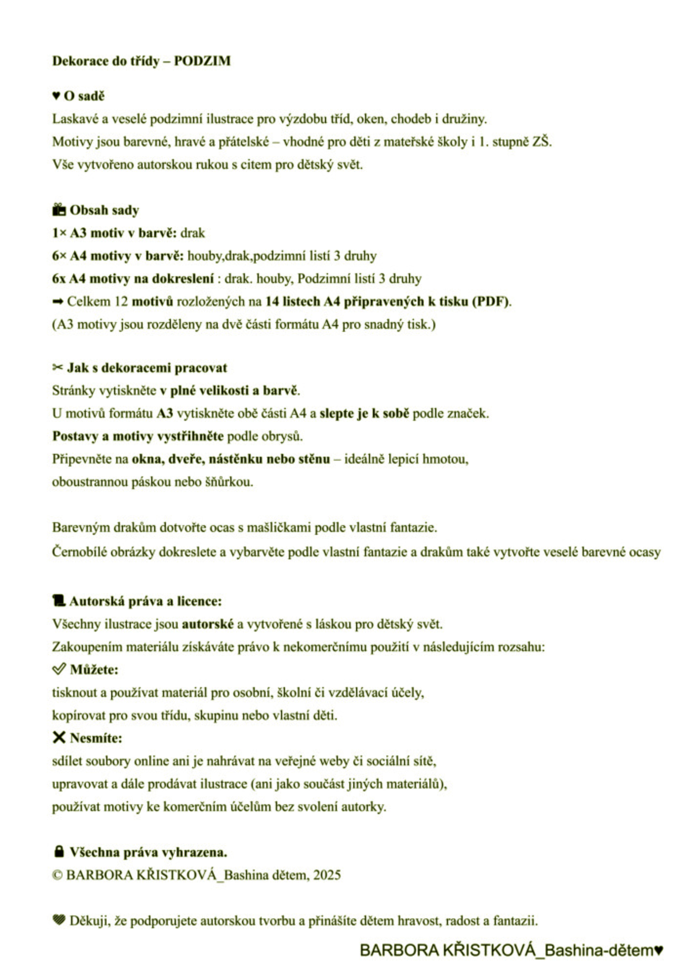 Součástí jsou pokyny k tisku, vystřihování a lepení, vše připravené tak, aby dekorace krásně vynikly na oknech, dveřích, nástěnkách nebo zdech.