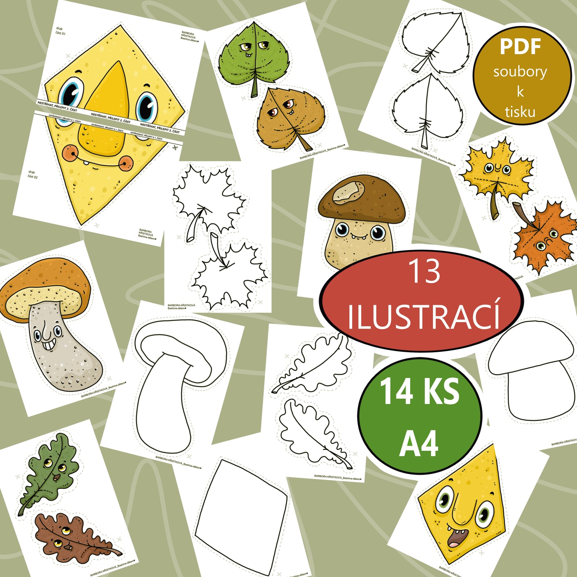 6x A4 motivy na dokreslení : drak. houby, Podzimní listí 3 druhy