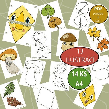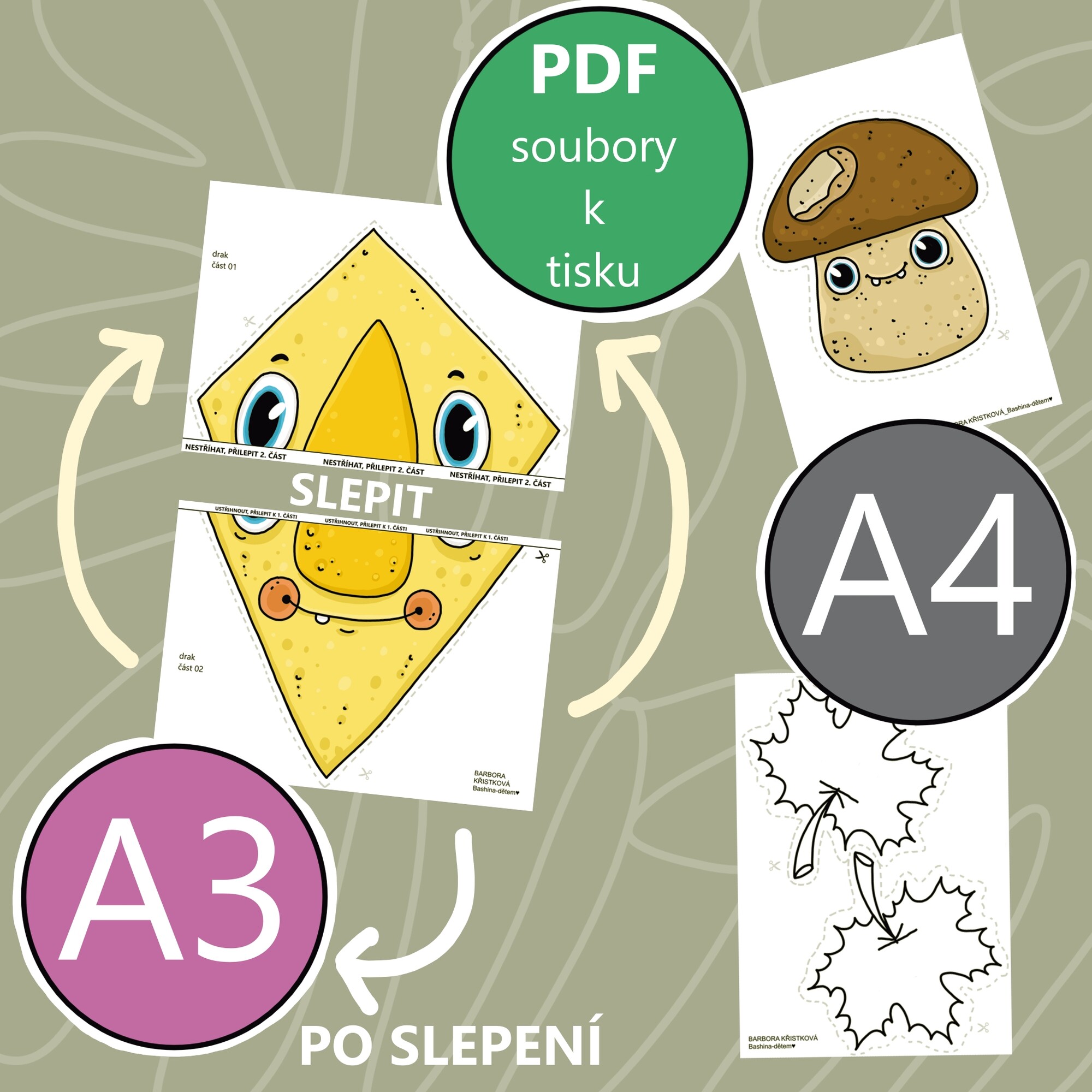 6× A4 motivy v barvě: houby,drak,podzimní listí 3 druhy
