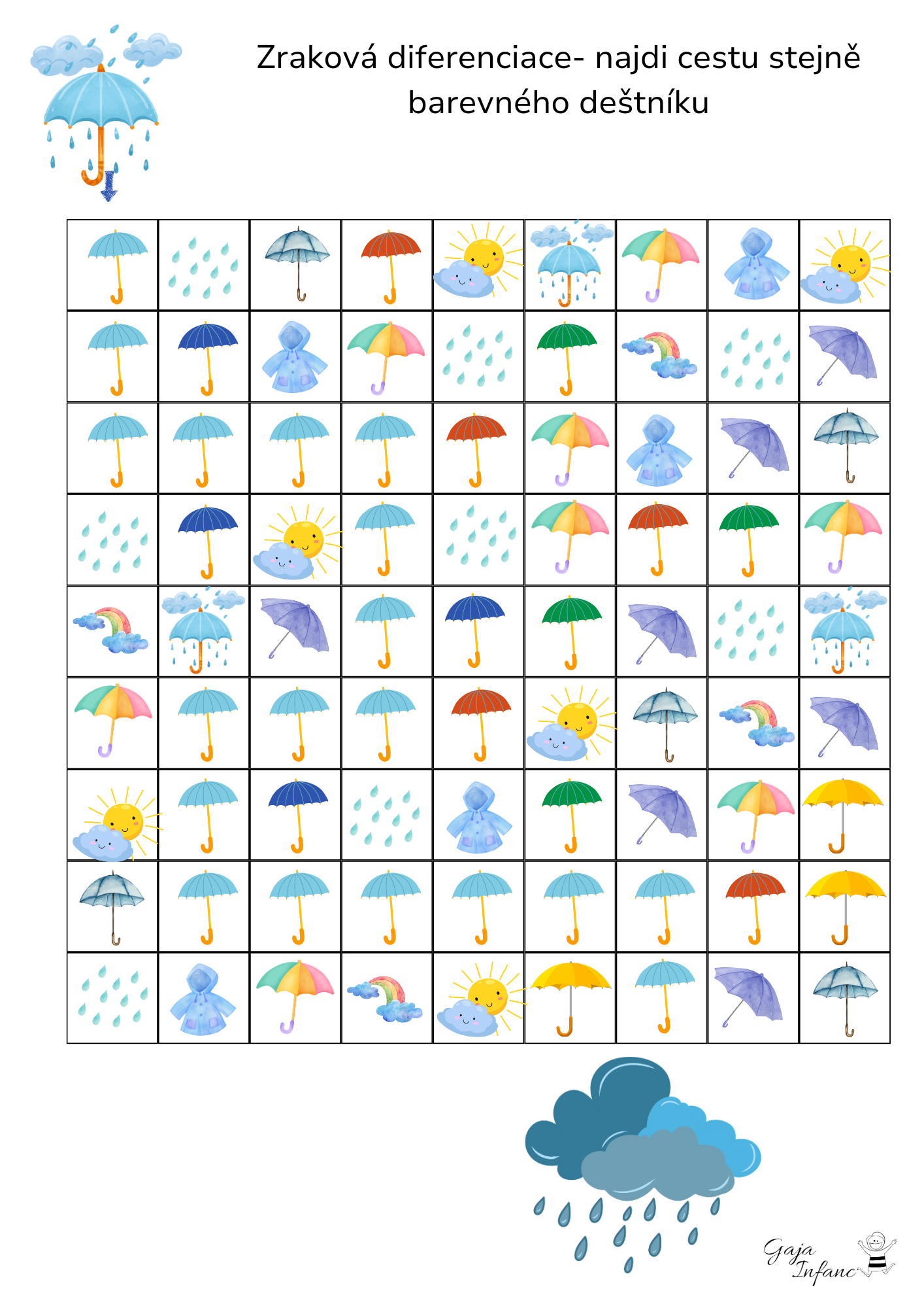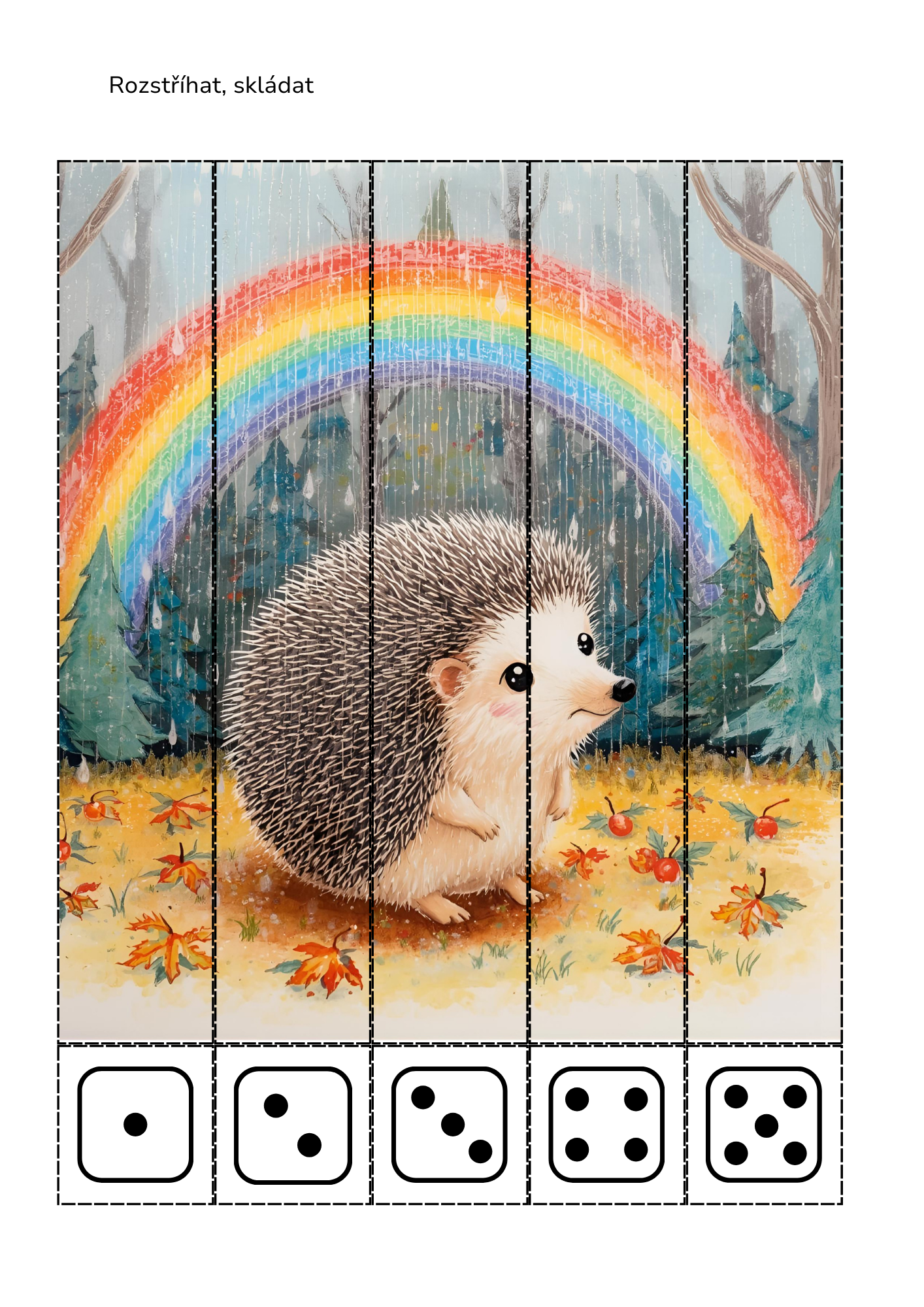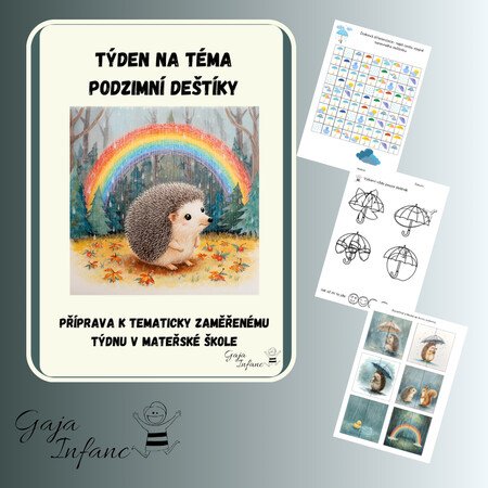 Tento materiál „Podzimní deštíky“ je zaměřen na procvičování barev a počtů. Motivační příběh děti vtahuje do děje, rozvíjí jejich představivost a podporuje porozumění slyšenému textu. Úkoly v pracovních listech i zábavné hry posilují logické myšlení, zrakovou diferenciaci, jemnou motoriku a zároveň motivují děti k samostatné práci i spolupráci ve skupině.