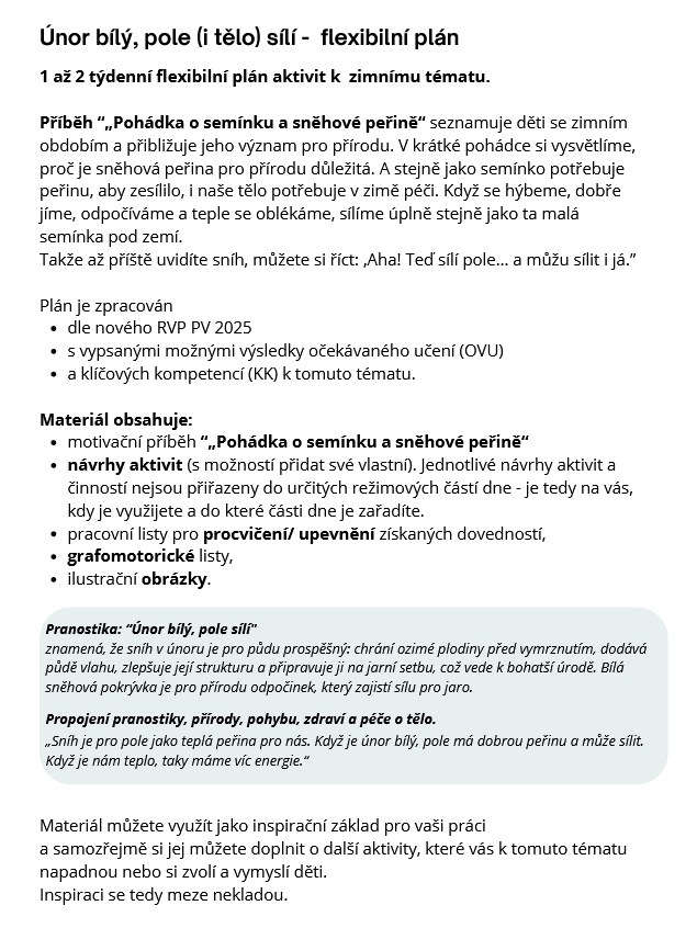 Příběh “„Pohádka o semínku a sněhové peřině“ seznamuje děti se zimním obdobím a přibližuje jeho význam pro přírodu. V krátké pohádce si vysvětlíme, proč je sněhová peřina pro přírodu důležitá. A stejně jako semínko potřebuje peřinu, aby zesílilo, i naše tělo potřebuje v zimě péči. Když se hýbeme, dobře jíme, odpočíváme a teple se oblékáme, sílíme úplně stejně jako ta malá semínka pod zemí.