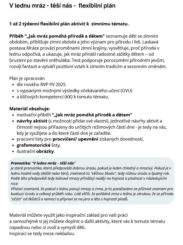 Příběh „Jak mráz pomáhá přírodě a dětem“ seznamuje děti se zimním obdobím, přibližuje zimní období a jeho význam pro přírodu i lidi. Laskavá postava Mráze provází proměnami zimní krajiny, vysvětluje, proč příroda v lednu odpočívá, a ukazuje, jak mráz přináší radostné zážitky dětem – od bruslení po stavění sněhuláka. Text podporuje porozumění přírodním jevům, rozvíjí fantazii a vytváří pozitivní vztah k zimním tradicím a sezonním změnám.
