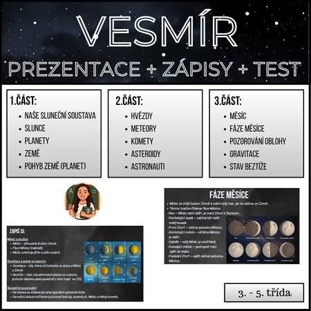 Tento soubor obsahuje prezentaci pro 5. třídu na téma vesmír. Prezentace je rozčleněna na 3 části. Po každé části zde najdete zápis pro žáky do sešitu. A na konci závěrečný test na vesmír.