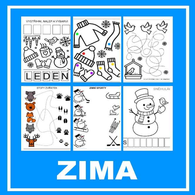 Zimní měsíce, jednoduché psaní, čtení, počítání, zvířátka v zimě, zimní oblečení, pexeso, spojovačky, malá postřehovka, ptáčci v zimě, jak se staví sněhulák-postup, skládanka, omalovánky, tajenky, tvary a barvy, vločky, zimní sporty.
