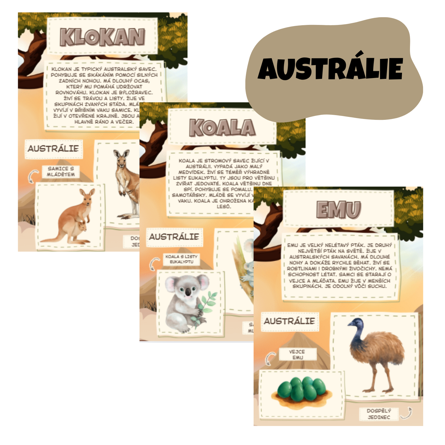 - klokan, koala, dingo, emu, ježura, ptakopysk