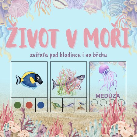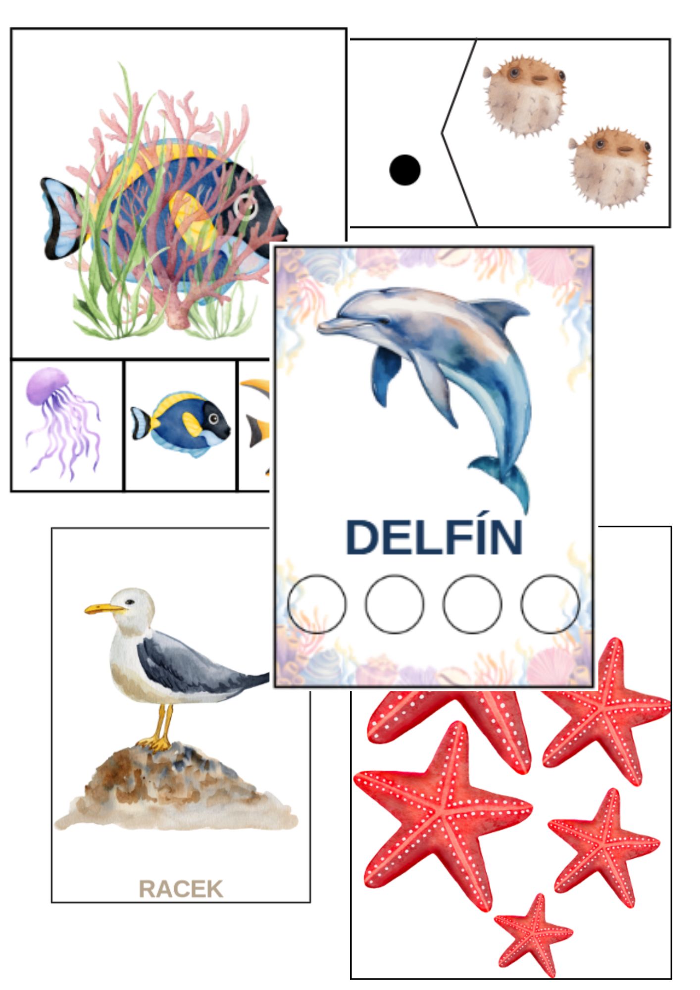 🔹 18× demonstračních obrázků mořských a pobřežních zvířat,