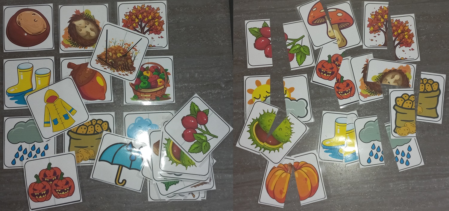 - PŮLENÉ OBRÁZKY. Další varianta může být individuální skládání polovic obrázků např. u stolečku s asistentem.