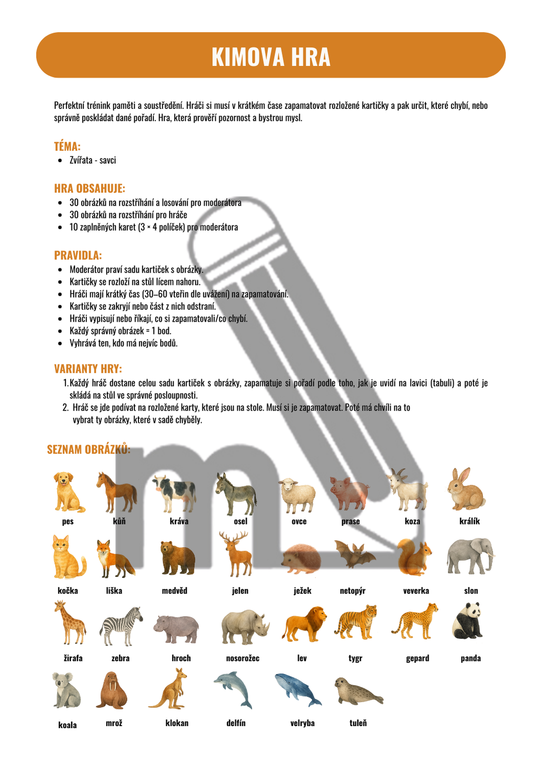 Perfektní trénink paměti a soustředění. Hráči si musí v krátkém čase zapamatovat rozložené kartičky a pak určit, které chybí, nebo správně poskládat dané pořadí. Hra, která prověří pozornost a bystrou mysl.