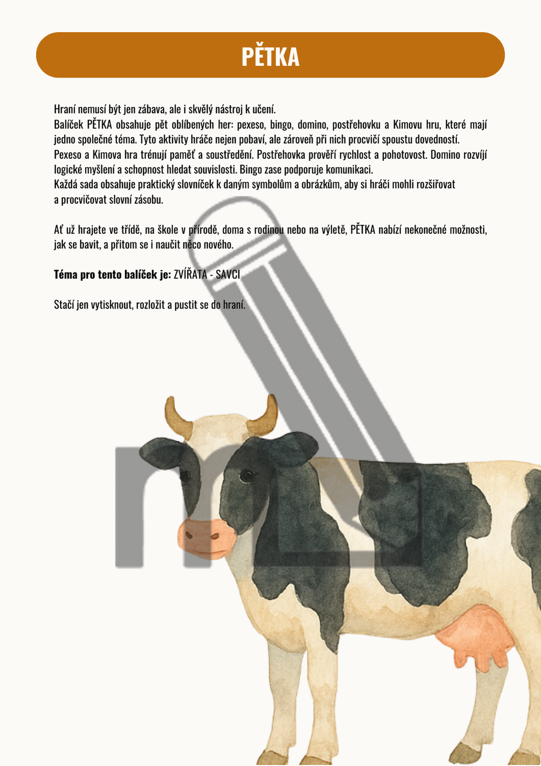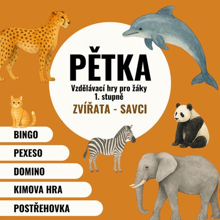 Balíček PĚTKA obsahuje pět oblíbených her: pexeso, bingo, domino, postřehovku a Kimovu hru, které mají jedno společné téma. Tyto aktivity hráče nejen pobaví, ale zároveň při nich procvičí spoustu dovedností a znalostí.
