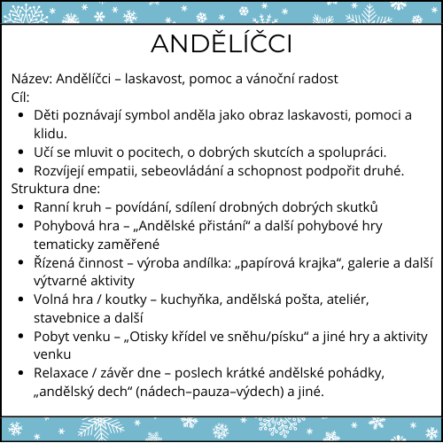 Ranní kruh – kdo je anděl (patří × nepatří), andělské scénky „co udělám, když…“, andělská zvuková krabička, smyslové hádanky s peříčkem a rolničkou.