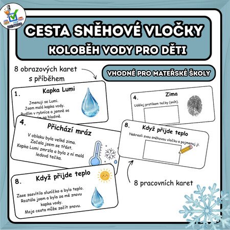 Vzdělávací materiál Cesta sněhové vločky – koloběh vody pro děti přibližuje dětem přírodní jev koloběhu vody hravou a názornou formou. Pohádkový příběh kapky Lumi provází děti jednotlivými fázemi proměny vody – od kapky, přes páru, oblak a sněhovou vločku až zpět ke kapce vody.