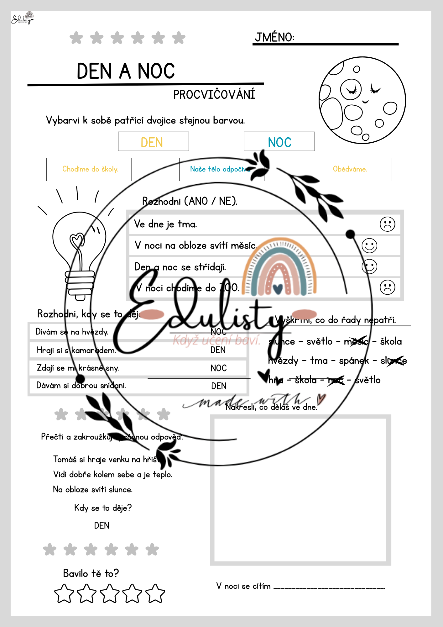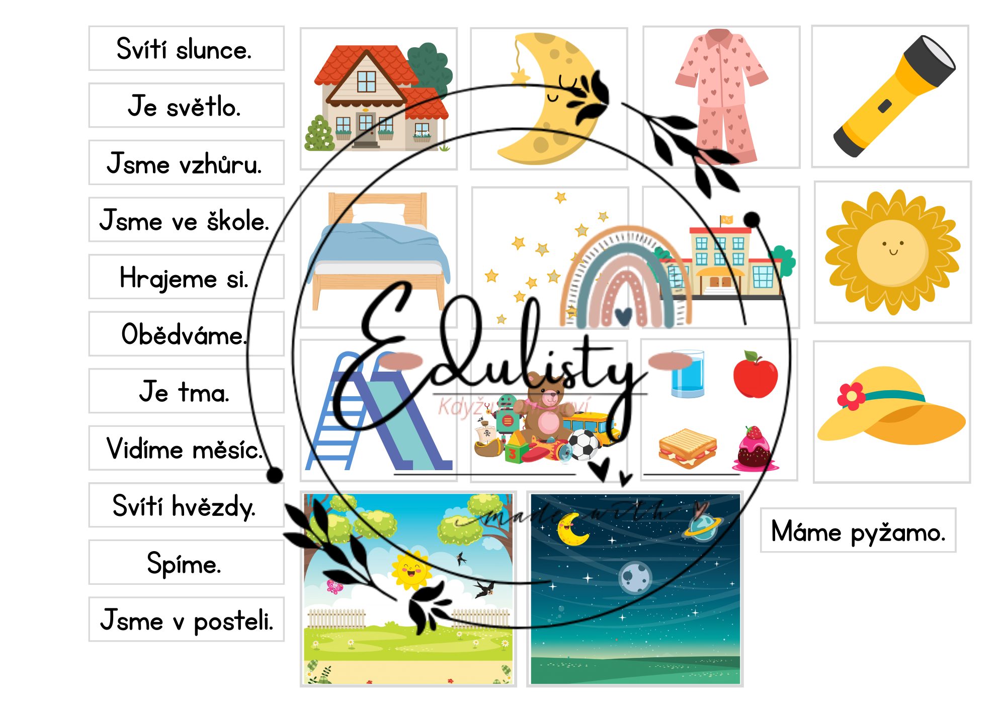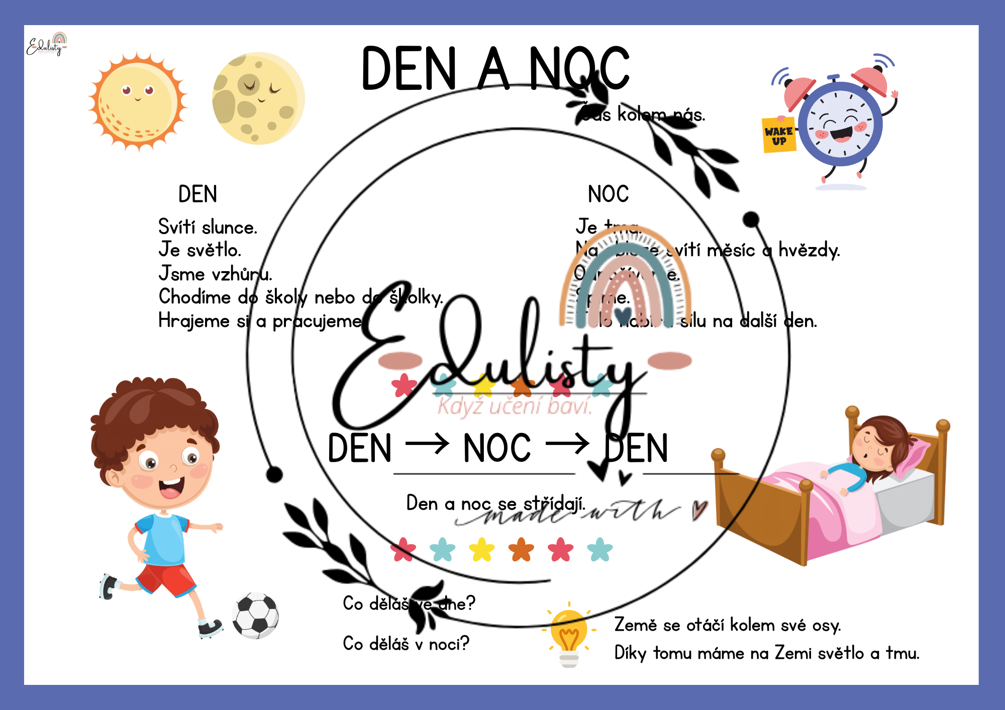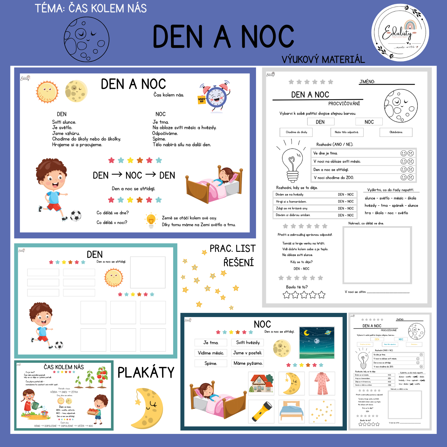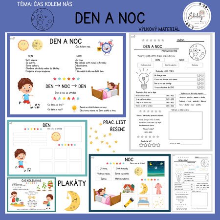 Materiál seznamuje děti s rozdílem mezi dnem a nocí a vysvětluje, proč se střídají. Děti si upevní, co je typické pro den (světlo, aktivita) a co pro noc (tma, odpočinek).