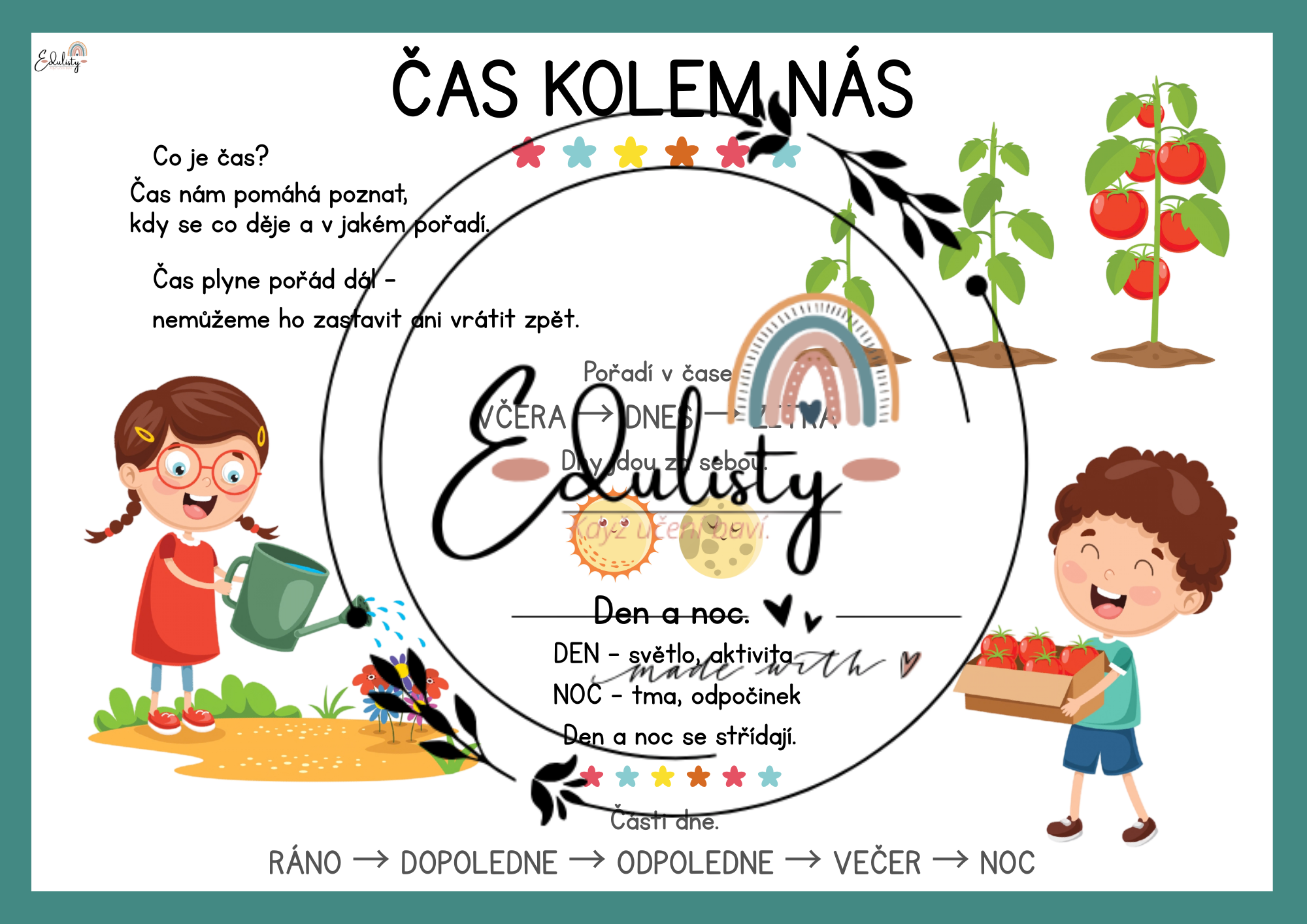 Materiál je součástí série Čas kolem nás a lze jej kombinovat s materiály Pořadí v čase, Roční období, Měsíce v roce, Dny v týdnu a Kalendář.