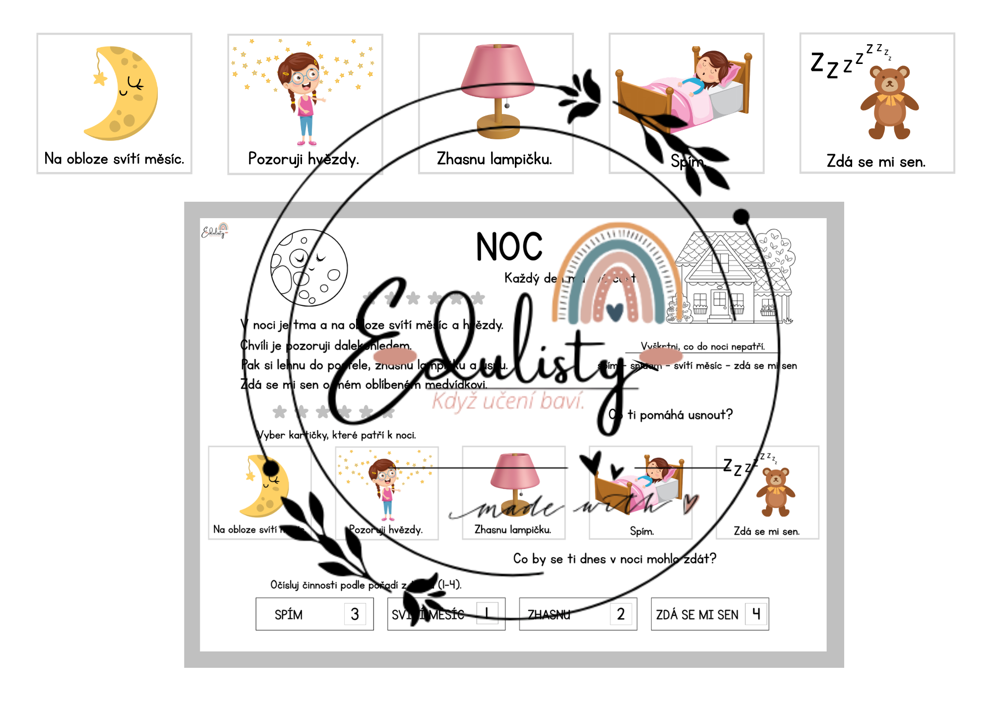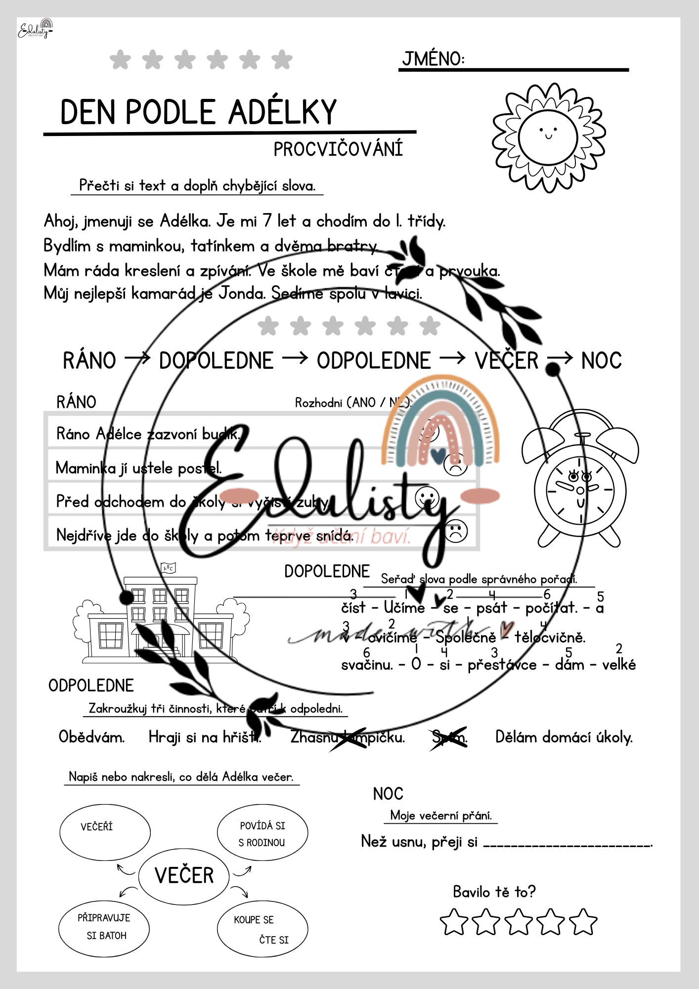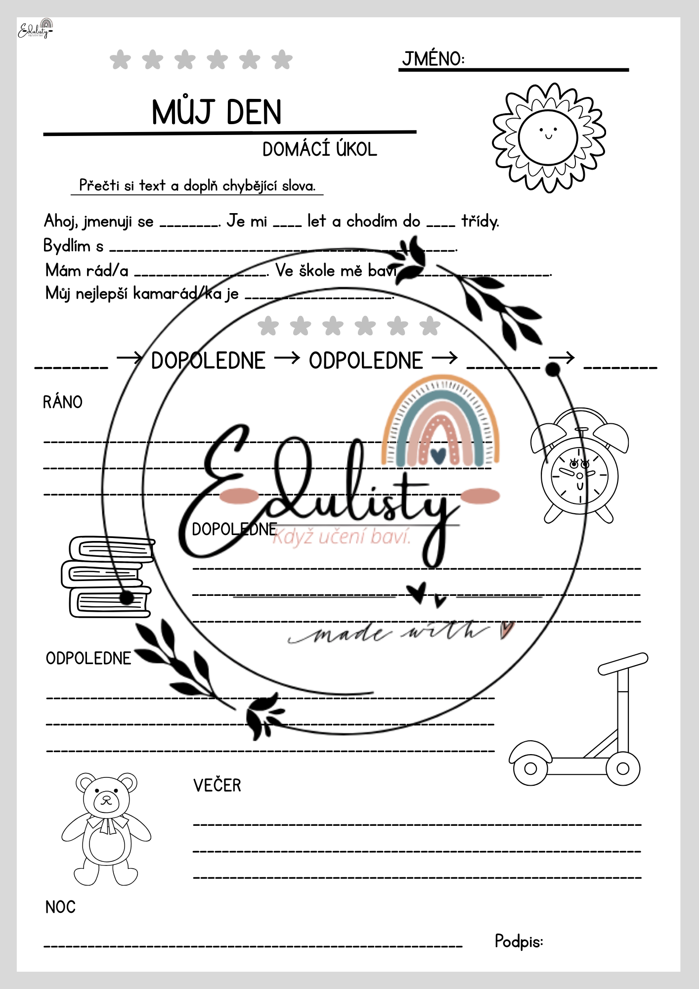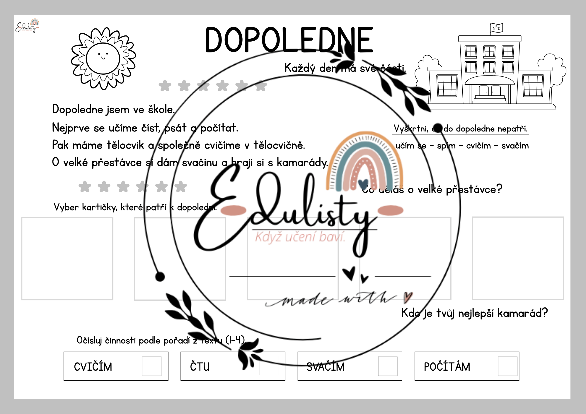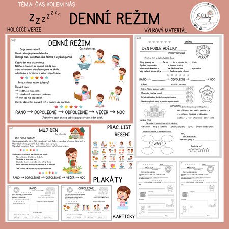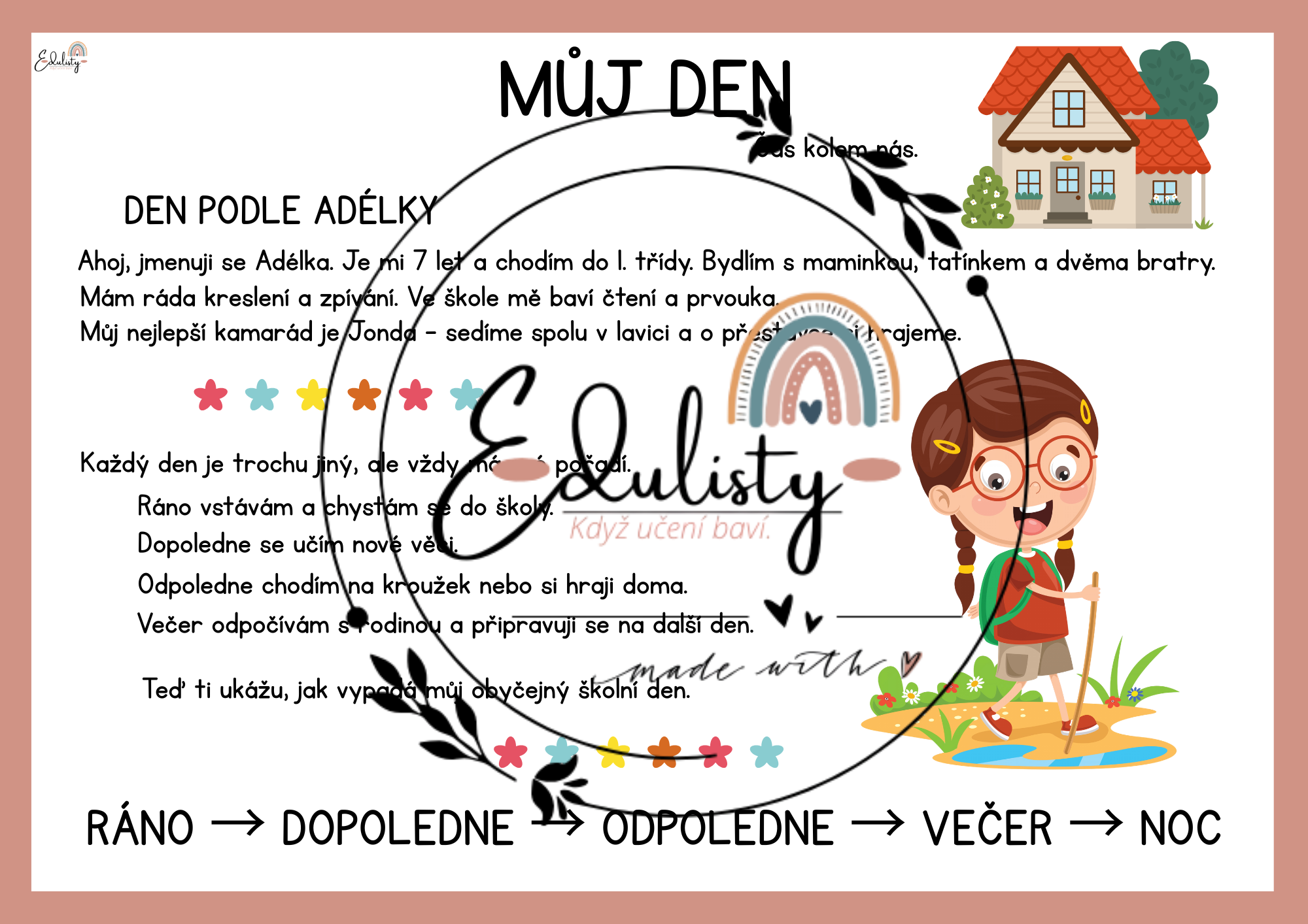 Děti třídí obrázkové kartičky podle části dne, řadí činnosti ve správném pořadí, doplňují texty a na závěr vytvářejí vlastní denní režim („Můj den“) – ve škole nebo jako domácí úkol. Materiál rozvíjí čtení s porozuměním, vyjadřování i schopnost plánovat a popsat svůj den.