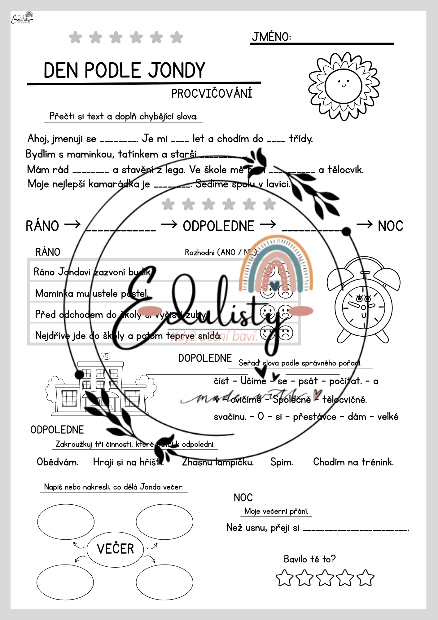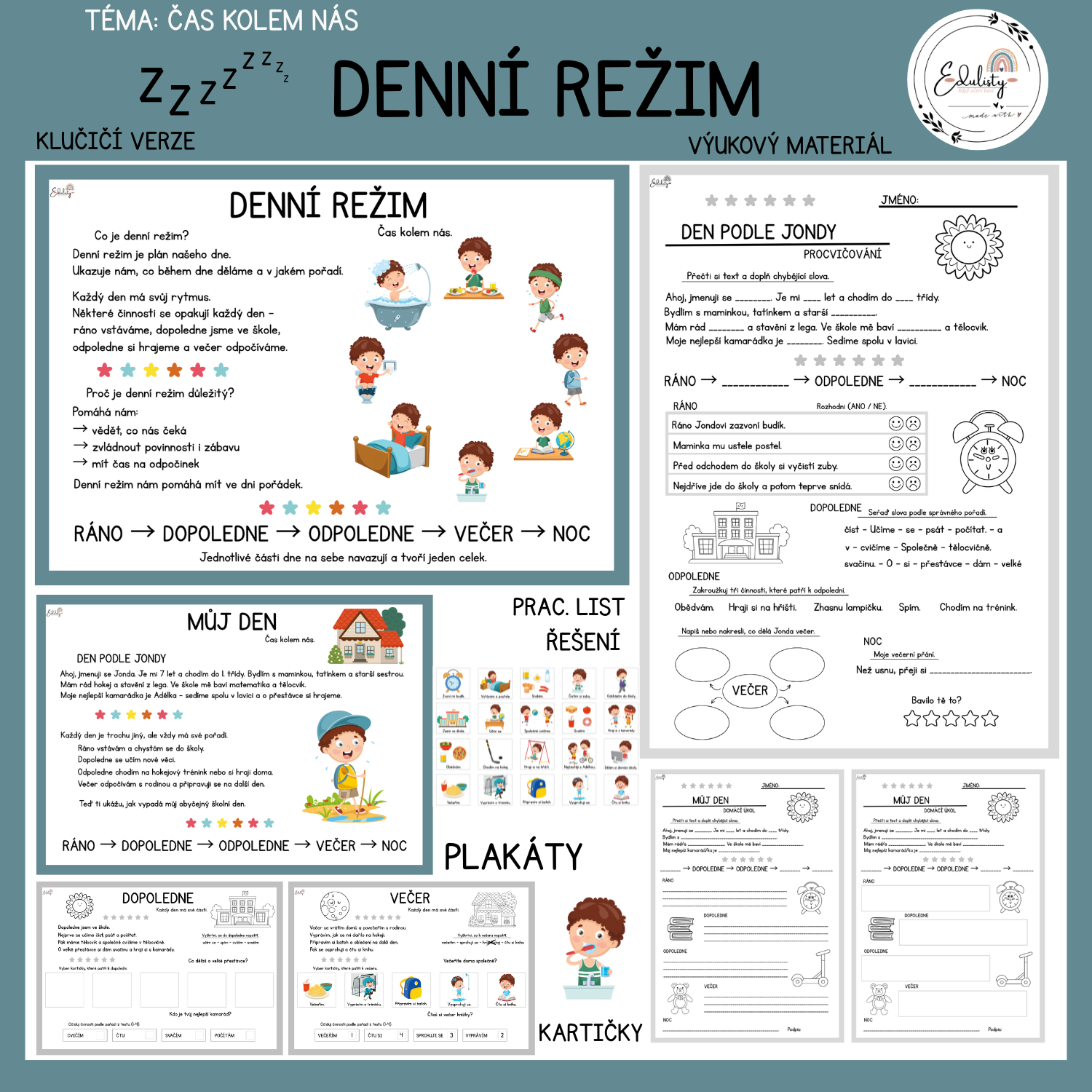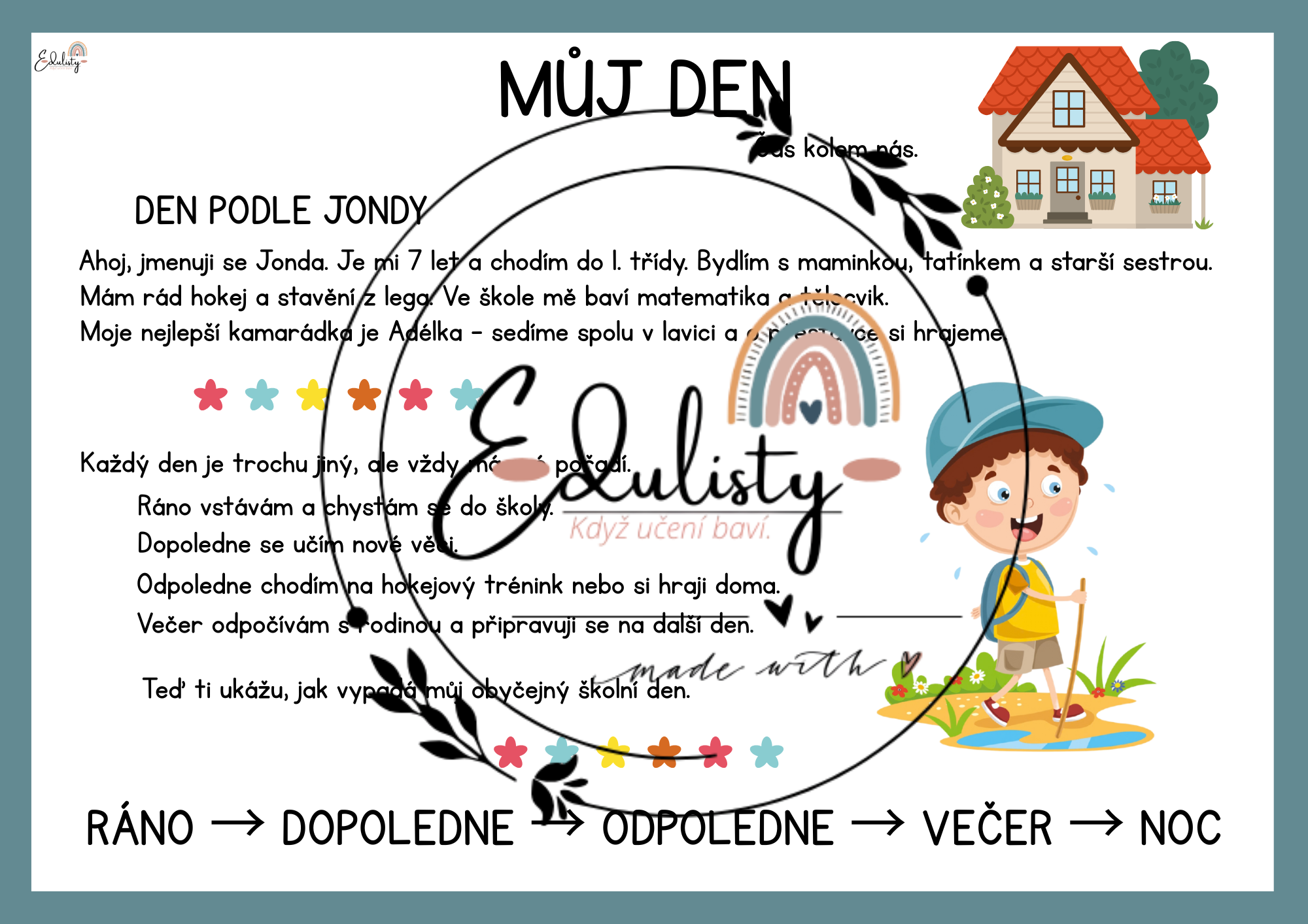 Materiál seznamuje děti s tím, co je denní režim a proč je důležitý. Na příběhu Jondy žáci sledují typický školní den a uvědomují si, jak na sebe jednotlivé části dne navazují – ráno, dopoledne, odpoledne, večer, noc.