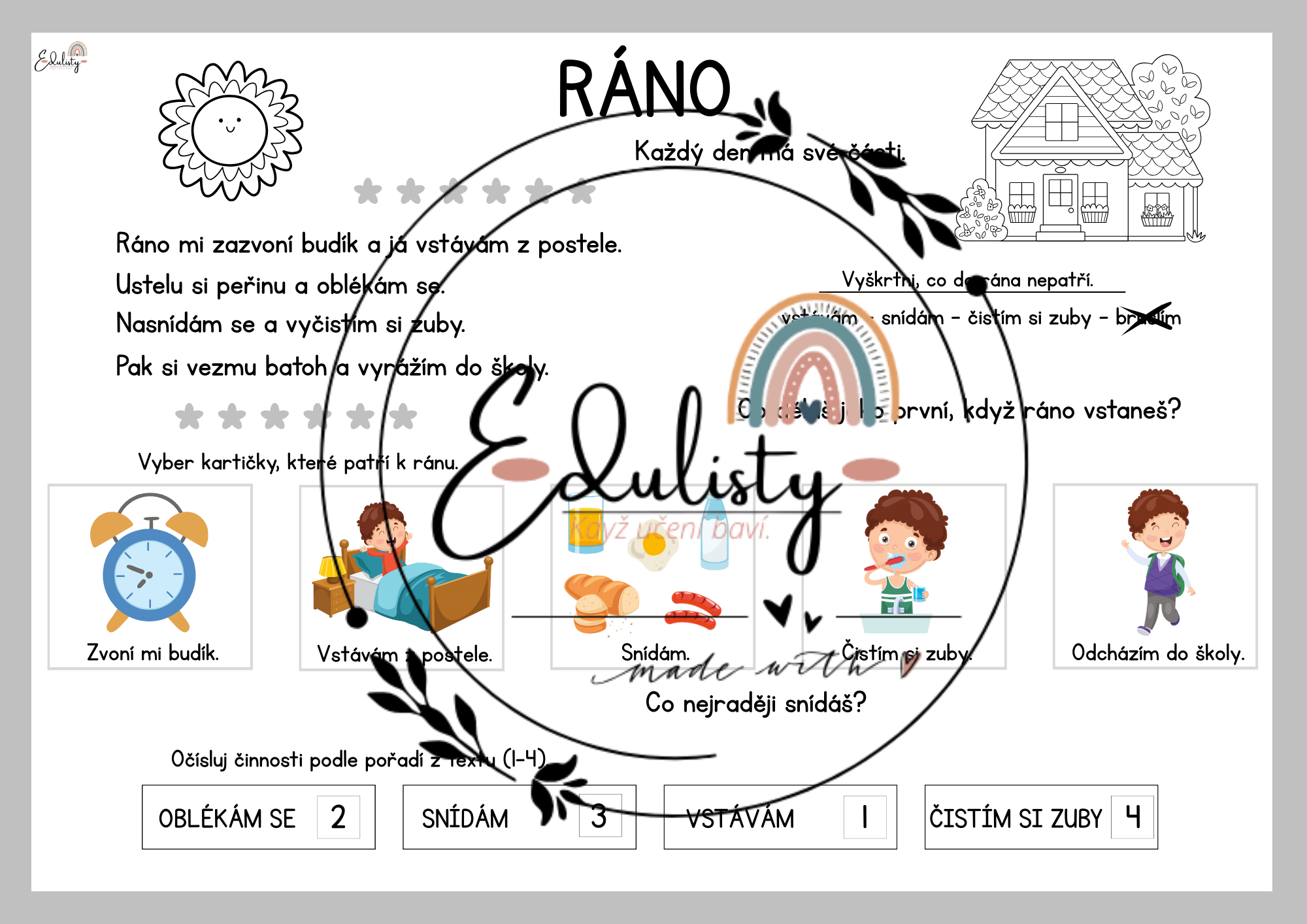 Materiál rozvíjí čtení s porozuměním, vyjadřování i schopnost plánovat a popsat svůj den.