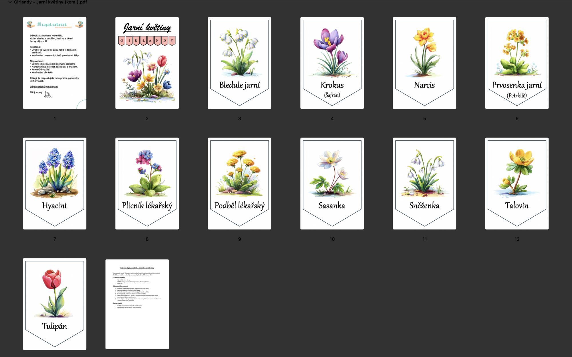 Tento jarní materiál je určen pro 1. stupeň ZŠ. Obsahuje 11 praporků, které tvoří ucelenou girlandu s názvy a obrázky jarních květin.