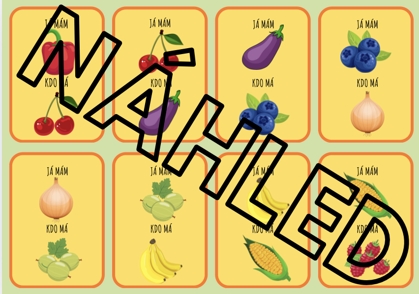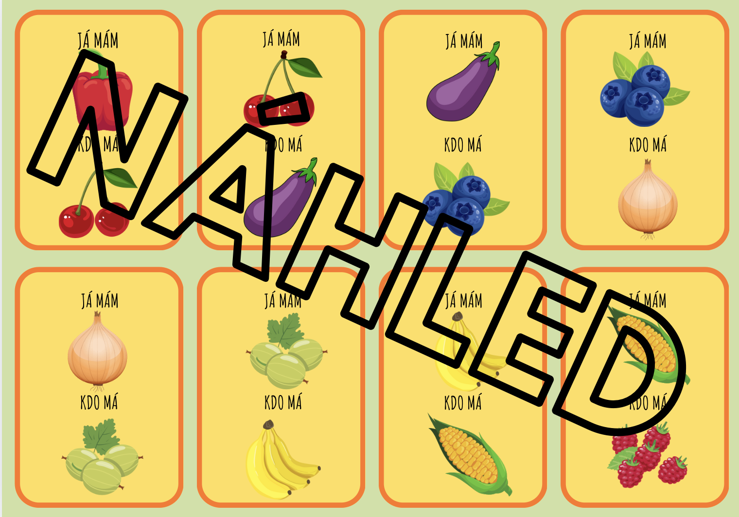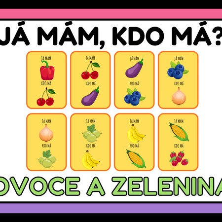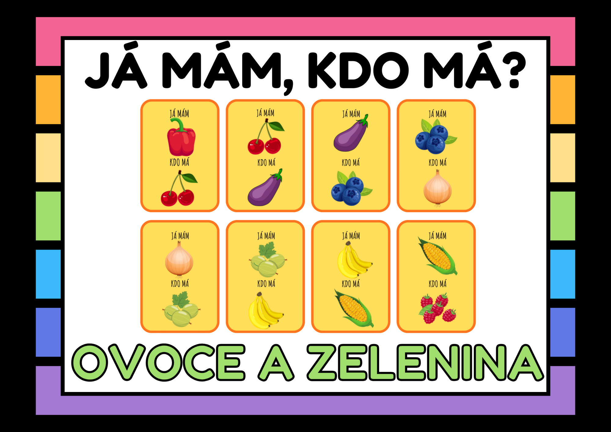 Kartičková hra Já mám, kdo má? na téma ovoce a zelenina. Vhodné jak pro děti v MŠ, tak žáky ZŠ.
