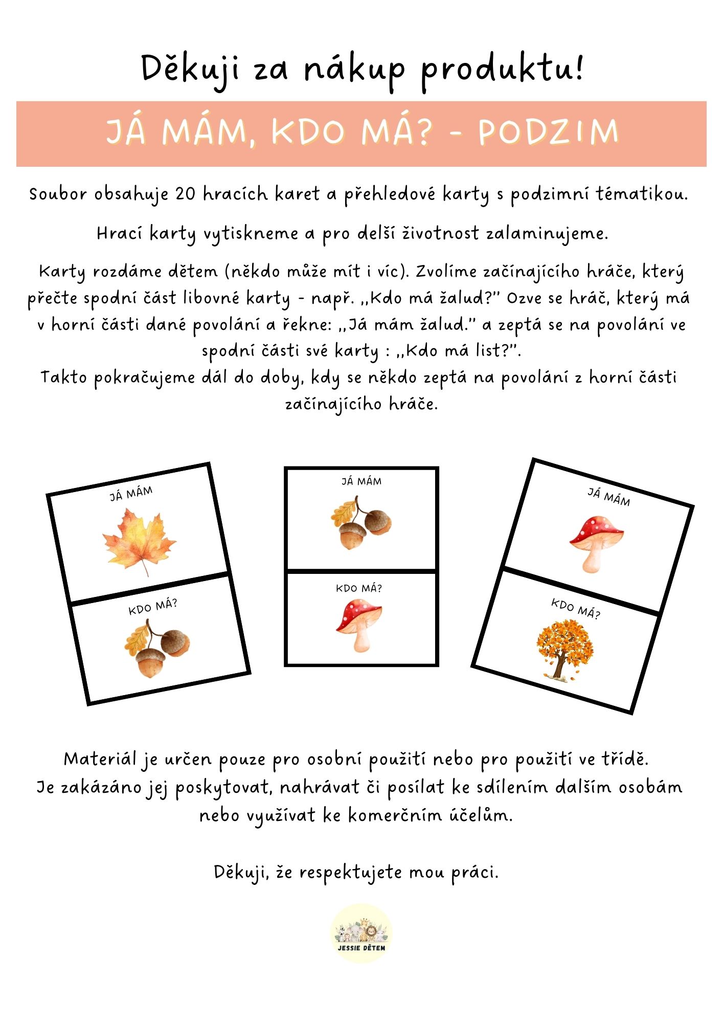 Každý hráč dostane kartu se dvěma obrázky. Děti na sebe navazují větou: „Já mám… Kdo má…?“ a vzniká zábavný řetěz, který udrží pozornost celé skupiny.