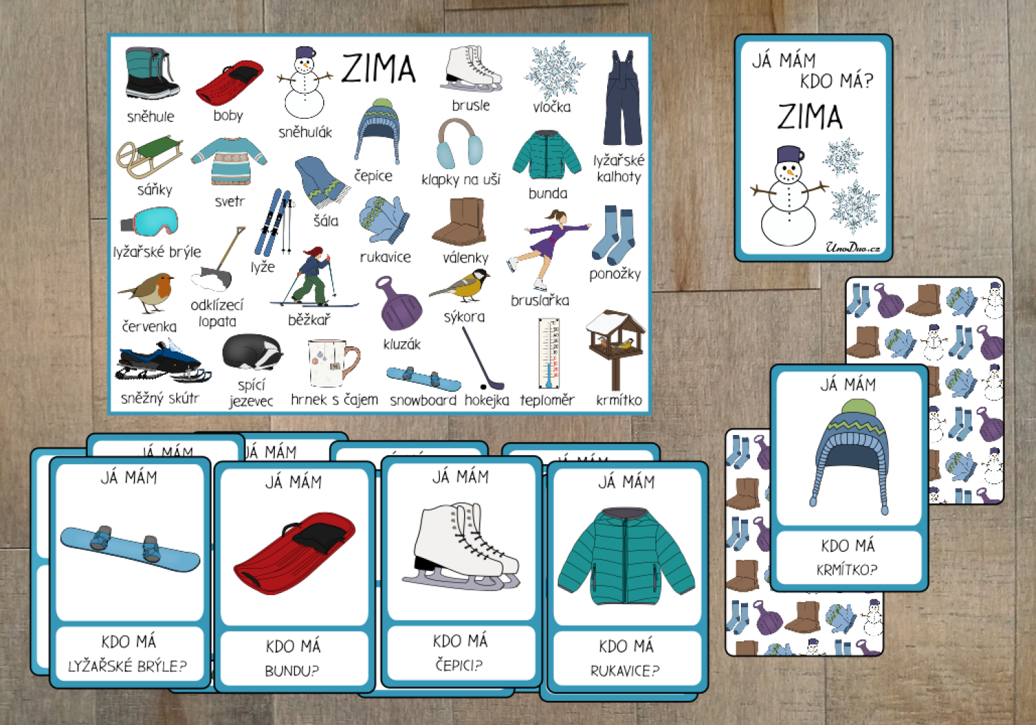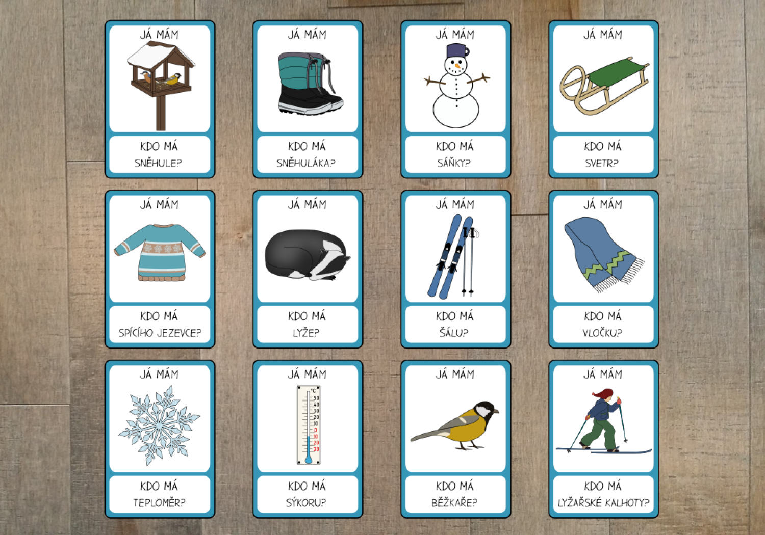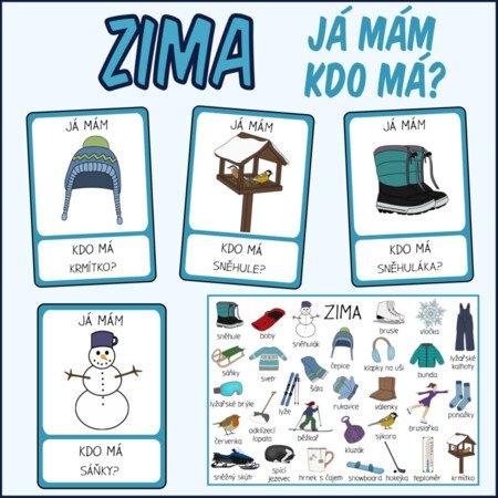Rozdáme karty mezi děti (někdo může mít více). Zvolíme začínajícího hráče, který přečte spodní část libovolné karty - např. "Kdo má krmítko?" Ozve se hráč, který má v horní části obrázek krmítka "Já mám krmítko" a zeptá se na věc ve spodní části své karty "Kdo má sněhule?" Takto pokračujeme dále do doby, kdy se někdo zeptá na věc z horní části karty začínajícího hráče.
