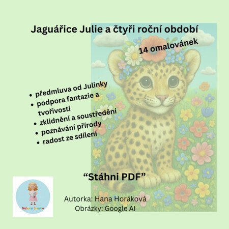 Vážená paní učitelko, vážený pane učiteli, připravila jsem pro Vás a Vaše žáky soubor omalovánek s názvem Jaguářice Julie a čtyři roční období. Tato omalovánka není jen obyčejným vybarvováním – je to cesta přírodou napříč všemi ročními obdobími. Děti se seznámí s jarními pampeliškami a rozkvetlými stromy, s letní úrodou melounů a lesních plodů, s kouzlem podzimních barev a s radostí zimní sněhové nadílky. Součástí omalovánky je také krátká předmluva od jaguářice Julie, ve které se dětem představí a poví jim pár milých vět o každém ročním období. Omalovánky přinášejí dětem nejen radost z tvoření, ale i prostor k objevování. Na závěr čeká na děti pochvala od Julie a poslední úkol, který jim pomůže prožít celý zážitek naplno a posílí jejich pocit, že něco důležitého dokončily. Co omalovánka dětem přinese: 1.Rozvoj jemné motoriky – trénují správný úchop tužky a koordinaci ruky a oka. 2.Podporu tvořivosti a fantazie – barvy volí podle své představivosti a rozvíjejí kreativní myšlení. 3.Zklidnění a soustředění – vybarvování děti uklidňuje a pomáhá jim soustředit se na činnost. 4.Poznávání přírody – děti objevují krásu ročních období a učí se vnímat svět kolem sebe. 5.Radost ze sdílení – vybarvené obrázky mohou ukázat spolužákům či rodičům, což posiluje jejich sebevědomí. Obsah omalovánek - 14 listů: rozkvetlé třešně pampelišková louka věneček z květin sladké třešně trnité ostružiny modravé borůvky ochutnávka melounu obilné pole noční dobrodružství sbírání kaštánků spadené listí stopy na sněhu ledová klouzačka Věřím, že omalovánka bude pro Vás i Vaše žáky přínosná, zpříjemní hodiny a nabídne společnou cestu přírodou, která baví i učí zároveň.