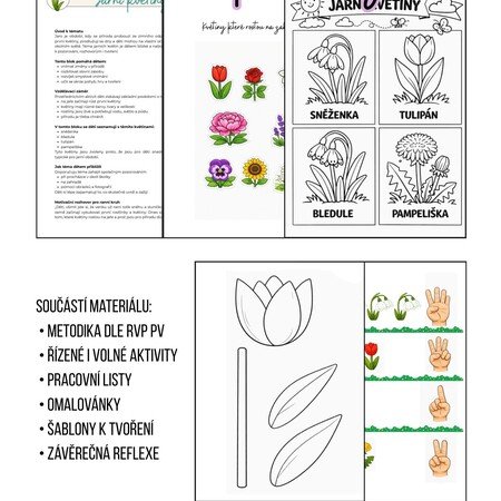 Kompletní tematický vzdělávací materiál k tématu jarních květin určený pro děti ve věku 3–6 let.