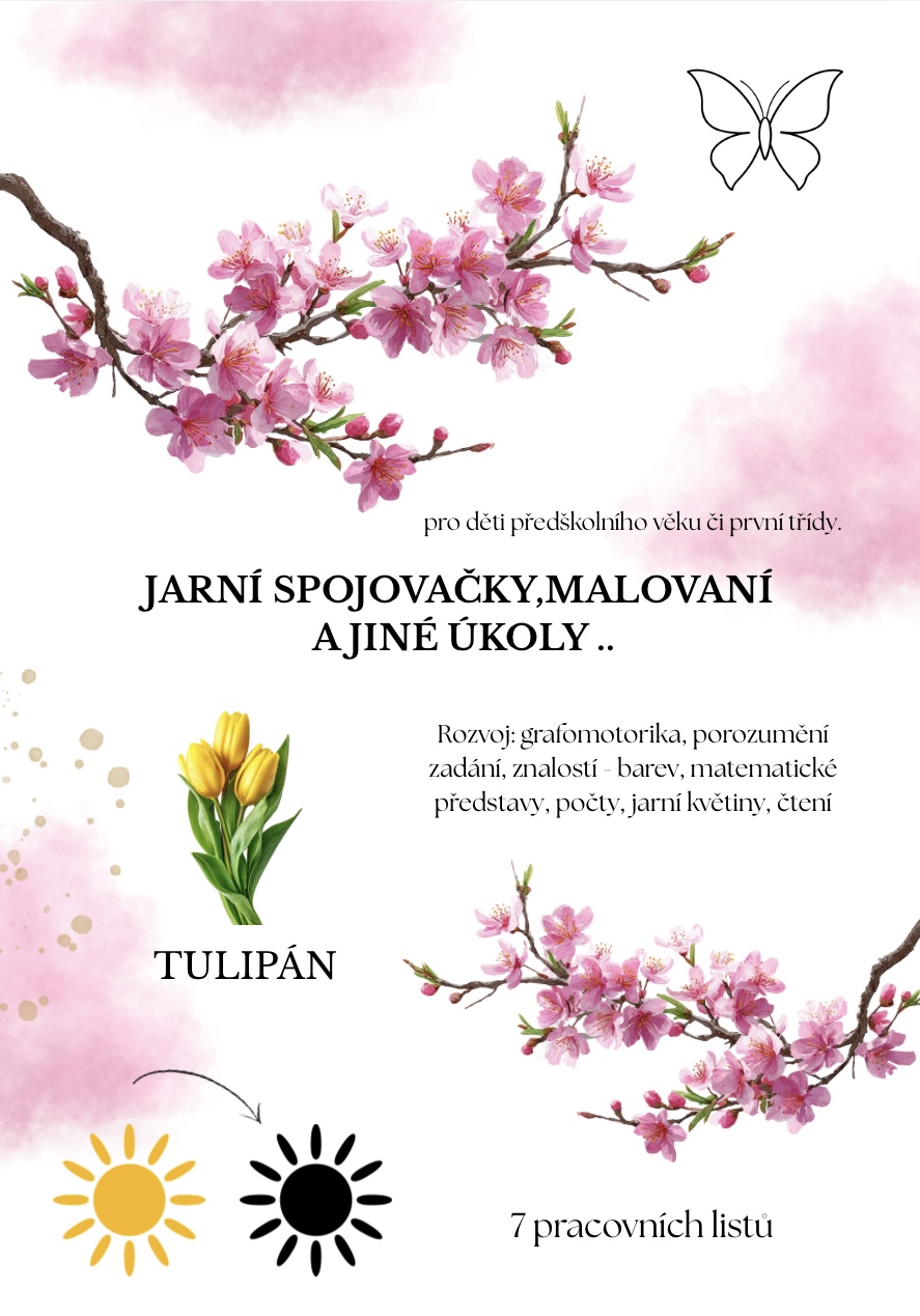 Rozvoj: grafomotorika, porozumění zadání, znalostí - barev, matematické představy, počty, jarní květiny, čtení