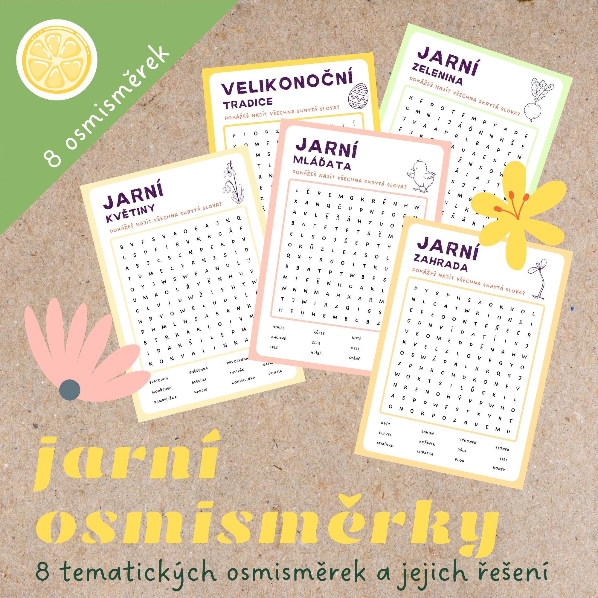 🌱Soubor obsahuje sadu osmisměrek a jejich řešení, tematicky zaměřených na jaro a Velikonoce. Děti se hravou formou seznámí s jarními květinami, zeleninou, probouzející se přírodou i velikonočními tradicemi, dobrotami a významnými dny.