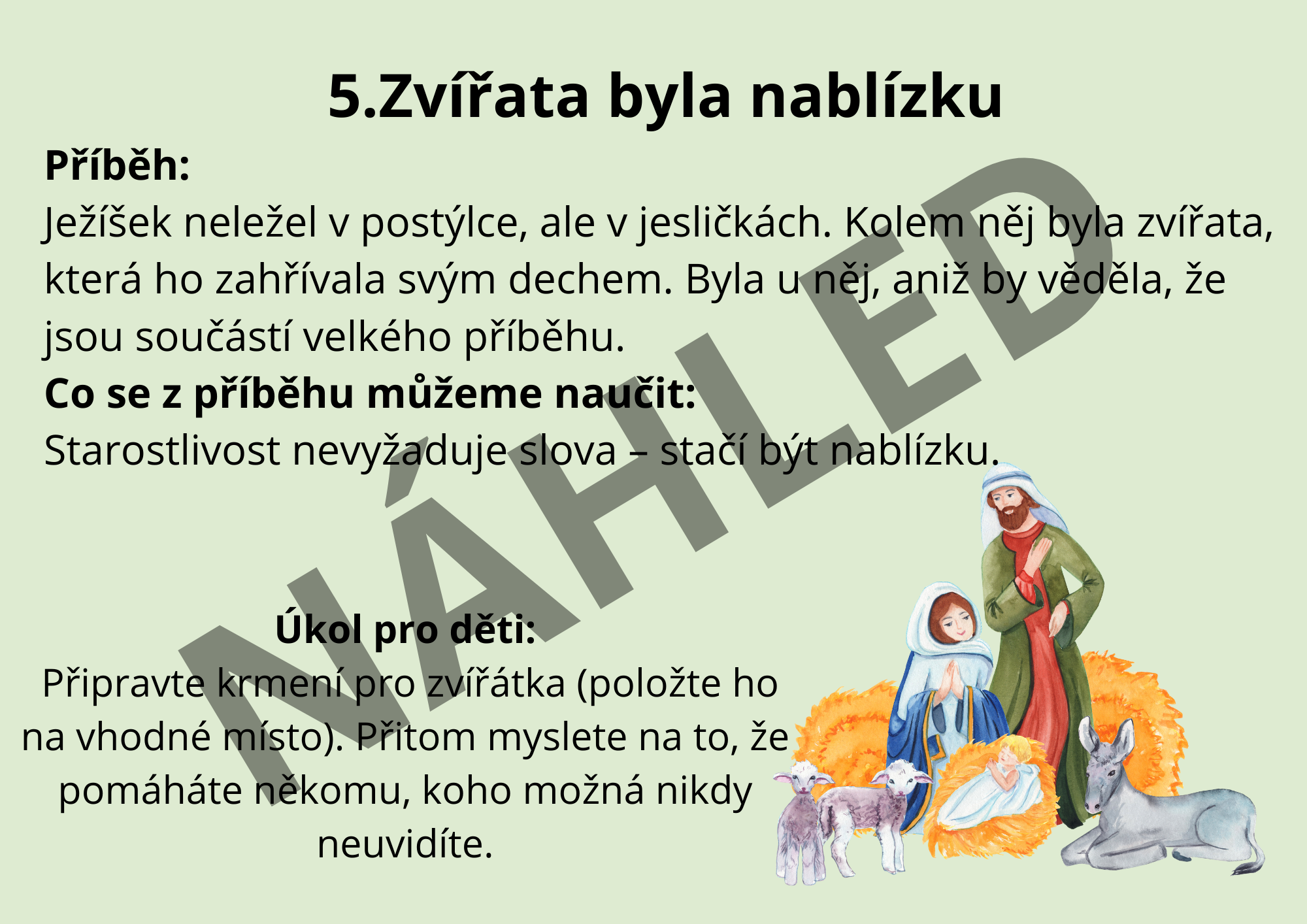 Materiál nabízí poučný příběh inspirovaný narozením Ježíška, rozdělený do osmi tematických částí, které jsou propojeny s praktickými úkoly v přírodě. Je určen pro děti prvního stupně a je koncipován jako prožitková aktivita v lese, při níž se vyprávění přirozeně propojuje s konkrétním jednáním dětí.