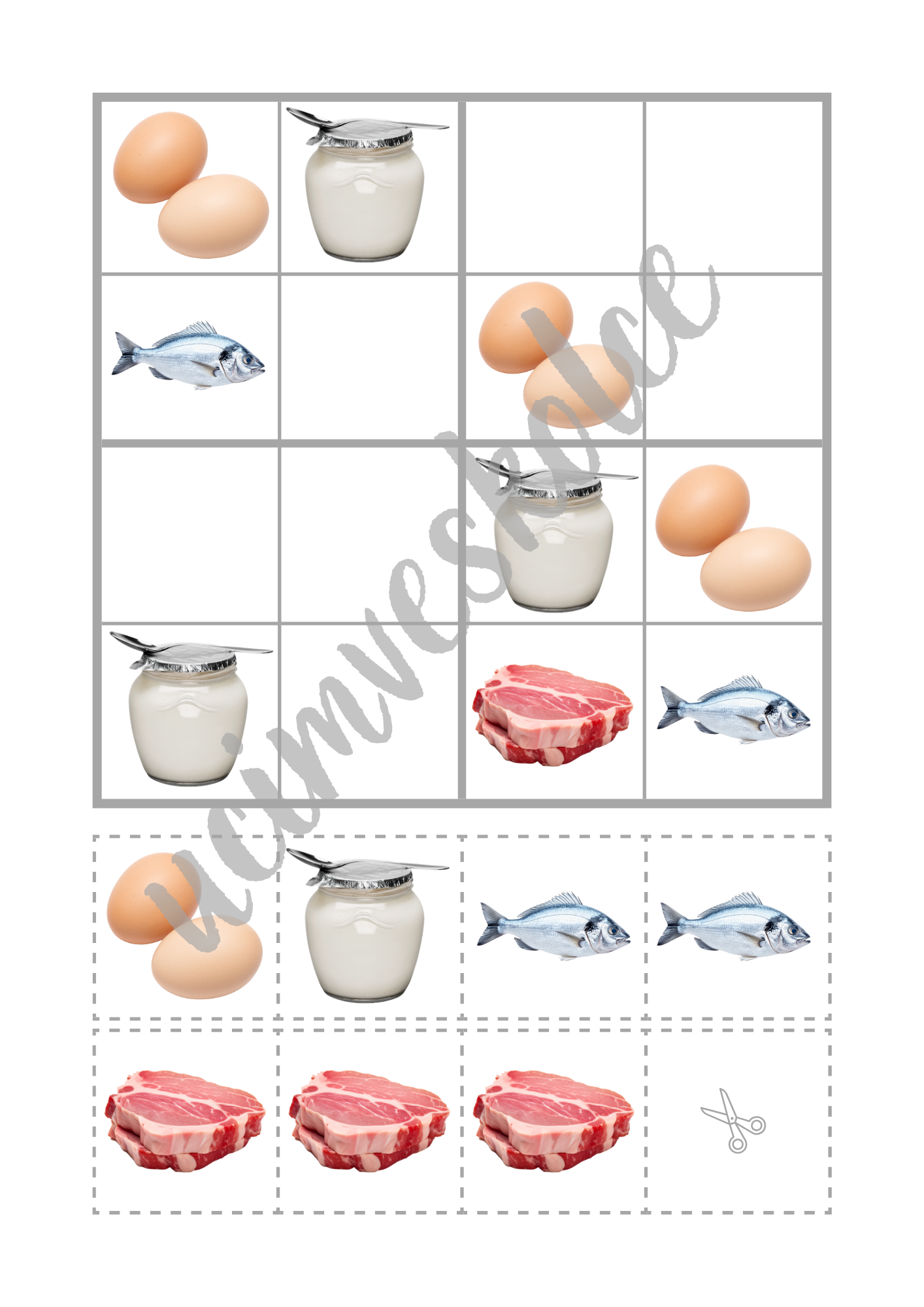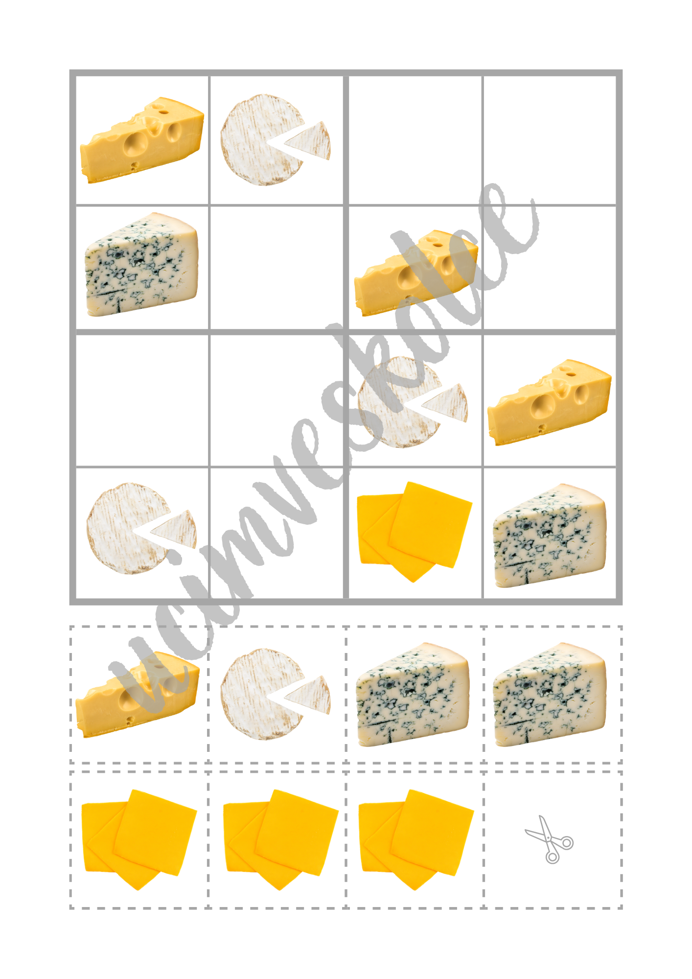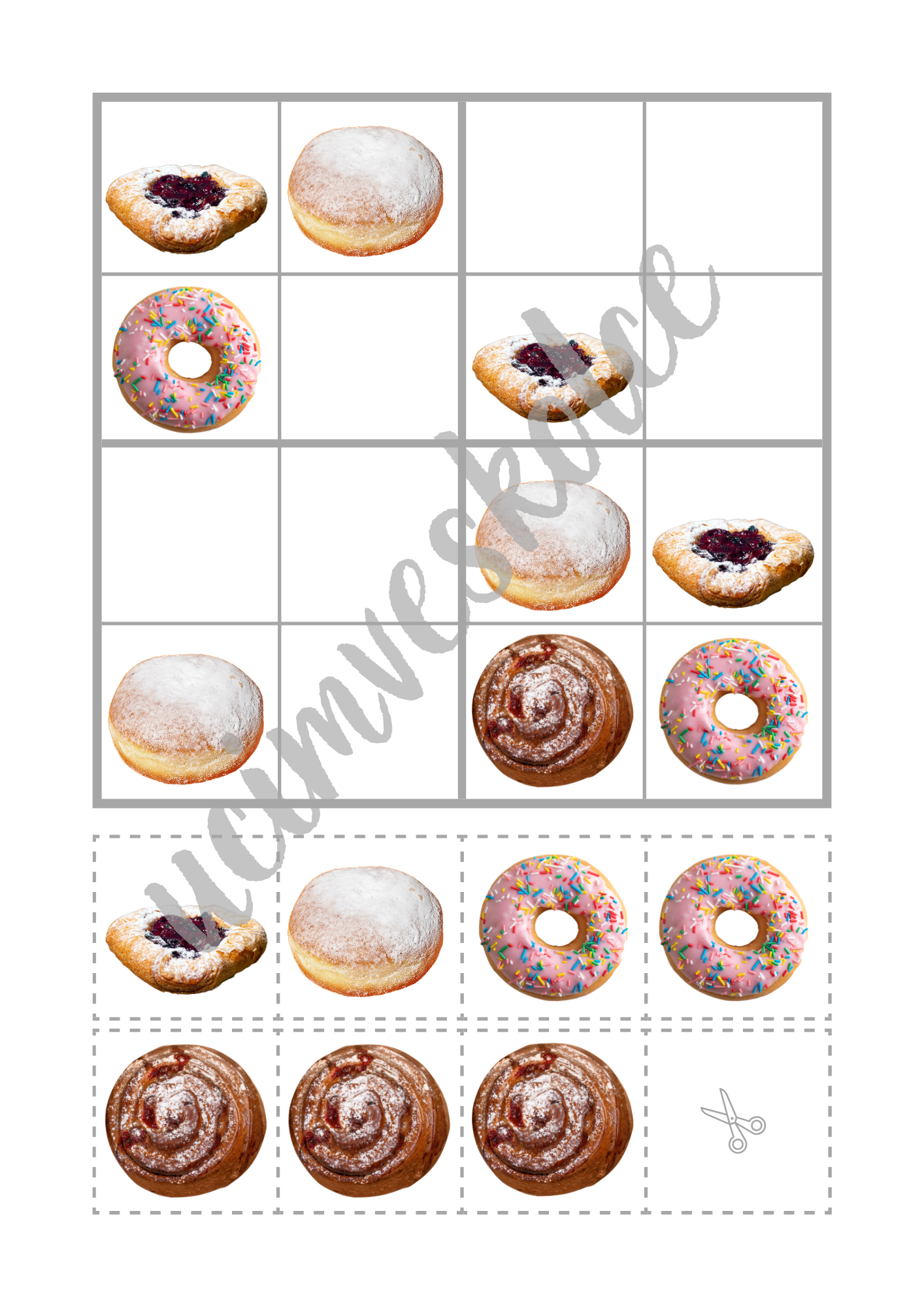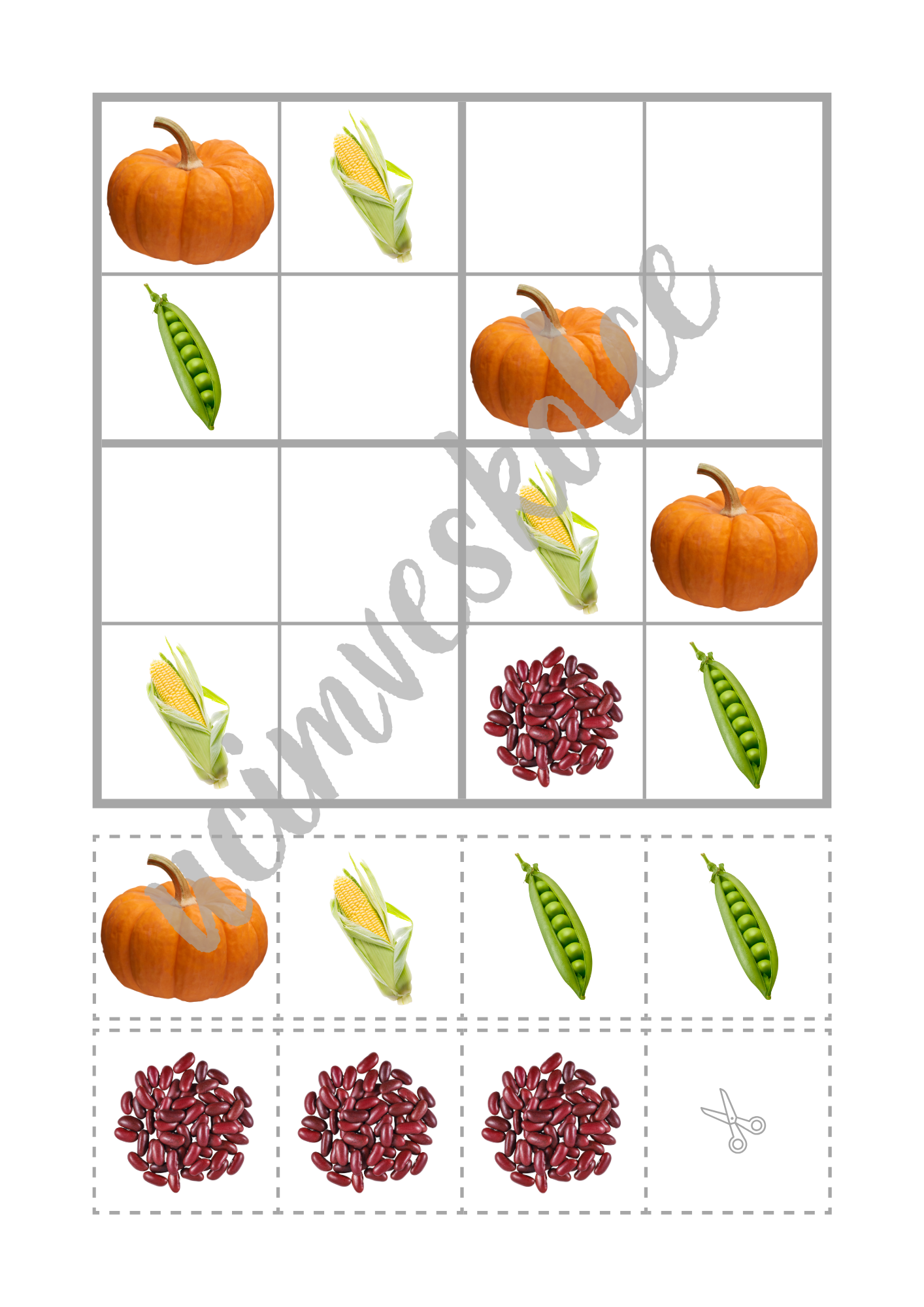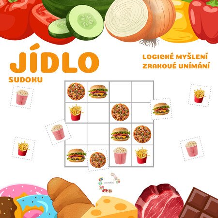 Soubor můžete též využít jako pracovní sešit / pracovní listy / brožuru - děti mohou vystřihnout pouze malé kartičky ze spodní části listu a nalepit je do sudoku tabulky v horní části listu nebo chybějící obrázky dokreslit / domalovat.