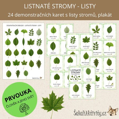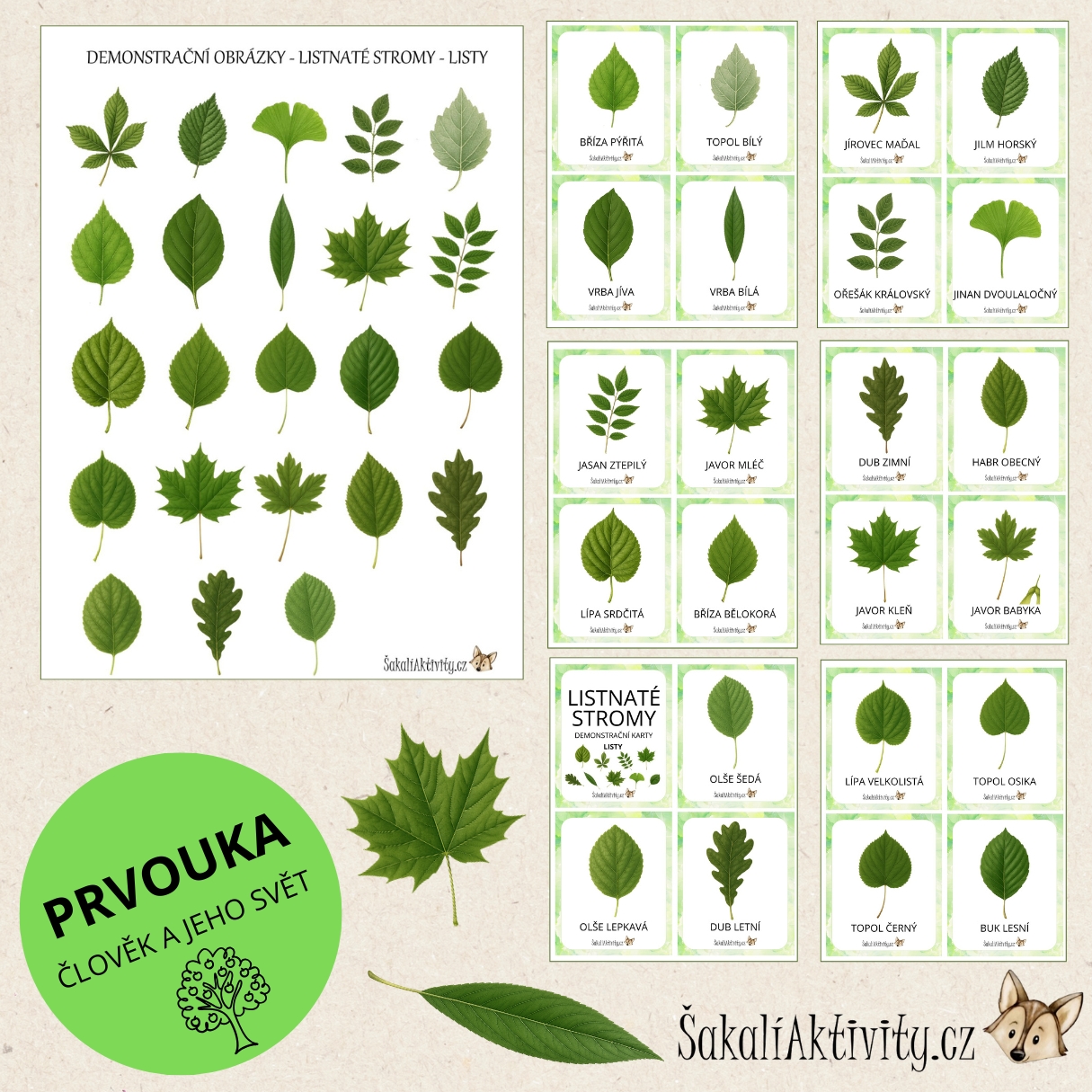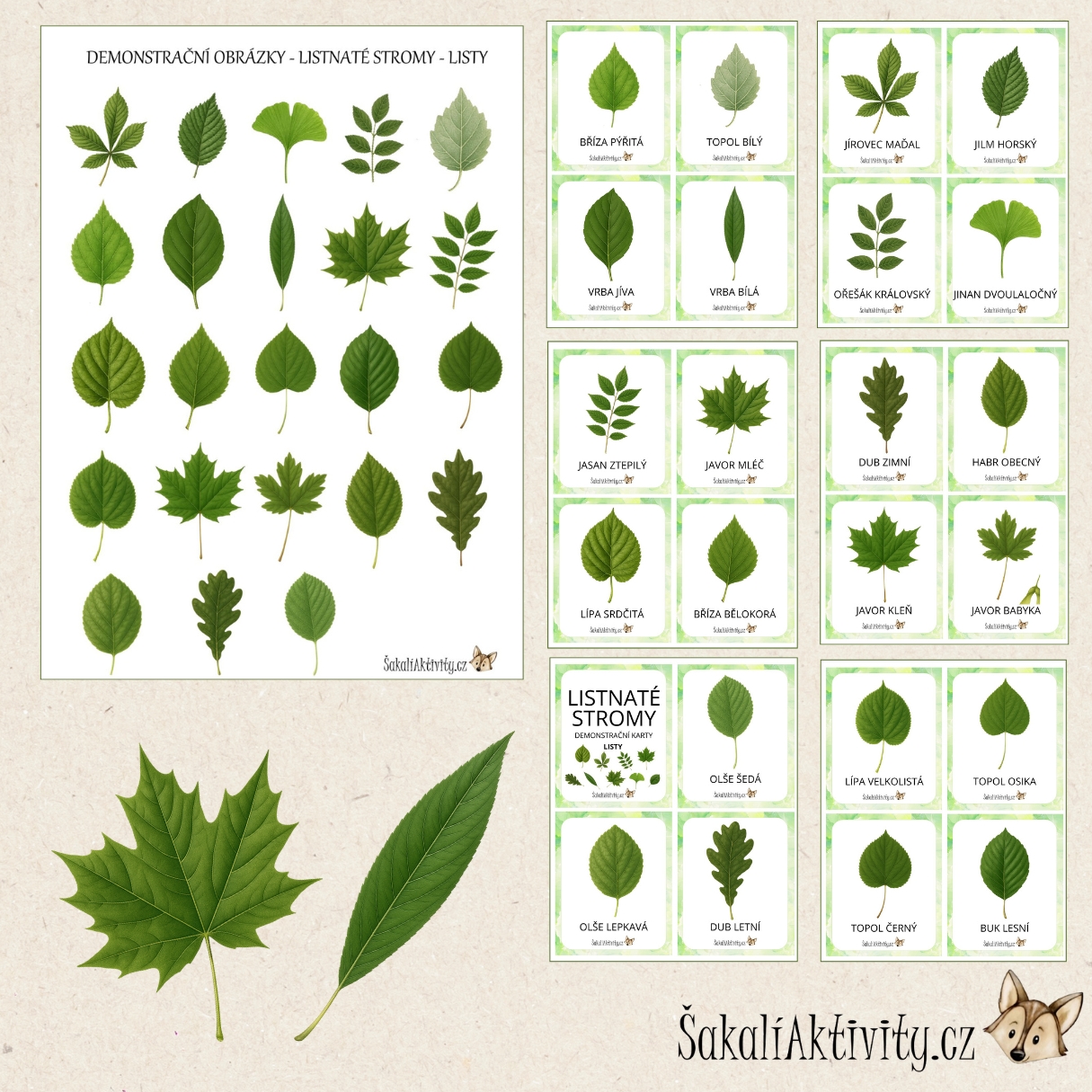 Demonstrační obrázky – listy listnatých stromů jsou vzdělávací materiál určený pro děti v mateřských i základních školách, školních družinách a domácí vzdělávání.