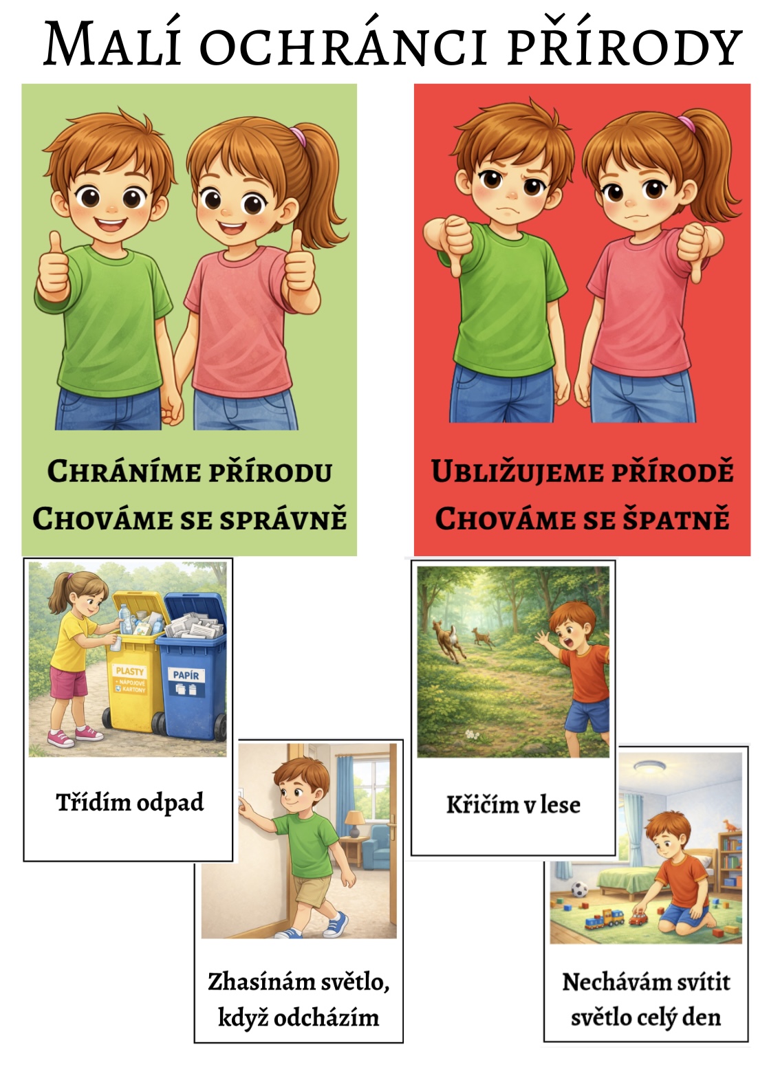 Malí ochránci přírody je didaktický soubor pro děti ve věku 3–6 let, který citlivou a srozumitelnou formou pomáhá dětem pochopit rozdíl mezi správným a nesprávným chováním k přírodě. Prostřednictvím 20 ilustrovaných situací děti třídí kartičky na „Chráníme přírodu“ a „Ubližujeme přírodě“, přemýšlí nad důsledky svého jednání a učí se, že i malé každodenní činy mají velký význam.