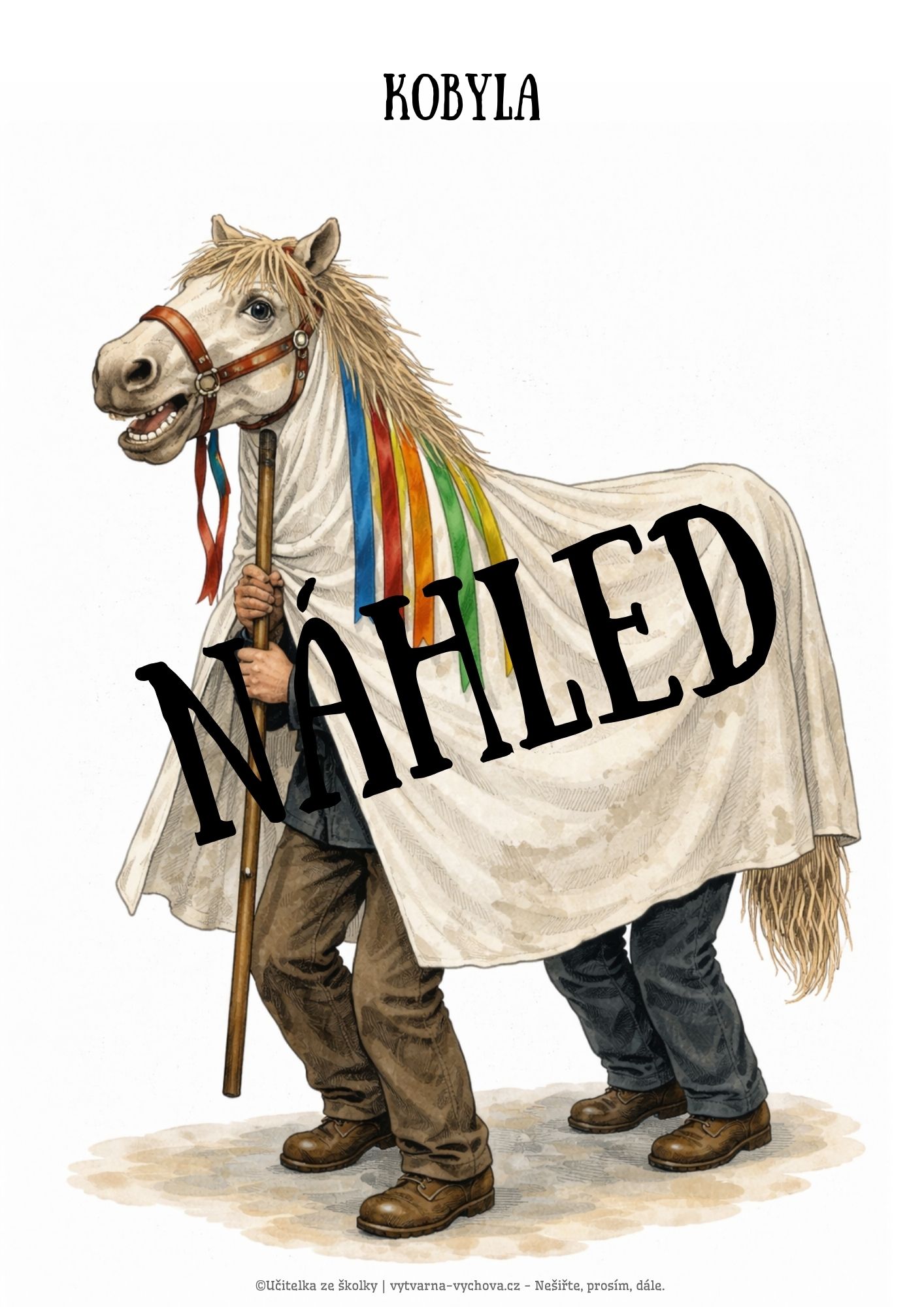 - 24 obrázků postav A4 s typickými znaky a rekvizitami: Laufr, kobyla, turek, medvěd, slaměný, bába s nůší, muzikant, cikánka, žid, nevěsta a ženich, smrtka, kat, jeptiška, vodník, šašek, kozel, kominík, řezník, holič, myslivec, doktor, policista, hasič, dráteník.