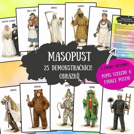 🎭Ucelená sada 25 demonstračních obrázků A4, která dětem představí bohatý svět masopustních masek. Na každém listu najdete jednu tradiční masopustní masku vykreslenou se všemi jejími detaily. Metodický průvodce vám prozradí, jak daná maškara vypadá, jaké rekvizity ke své roli potřebuje a co přesně v průvodu vyvádí.