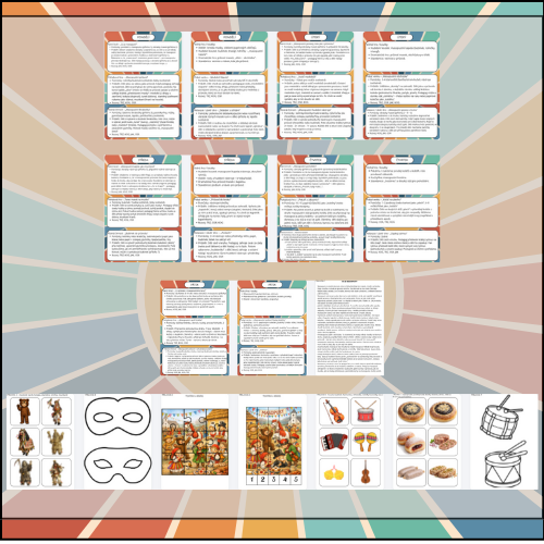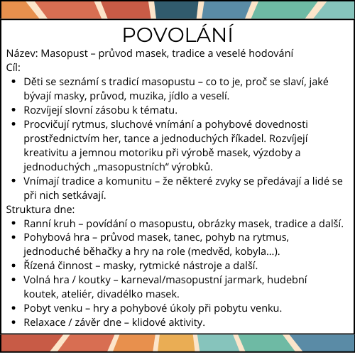 ✅ Ideální jako tematický týden s vyvrcholením v pátek: masopustní průvod a pohoštění.