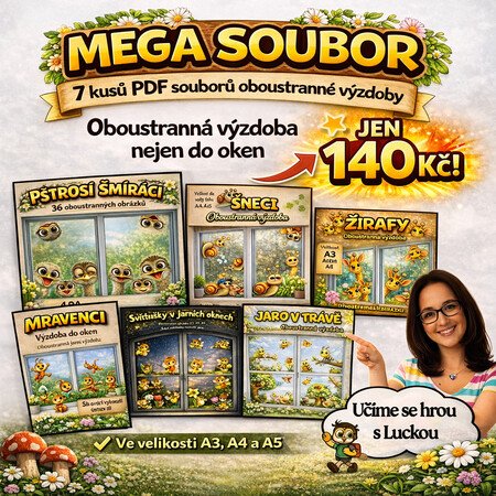 Tento materiál je megasoubor oboustranné výzdoby do oken, který obsahuje 7 samostatných PDF souborů. Každý z nich je tvořen obrázky určenými k oboustrannému tisku a následnému využití jako dekorace.